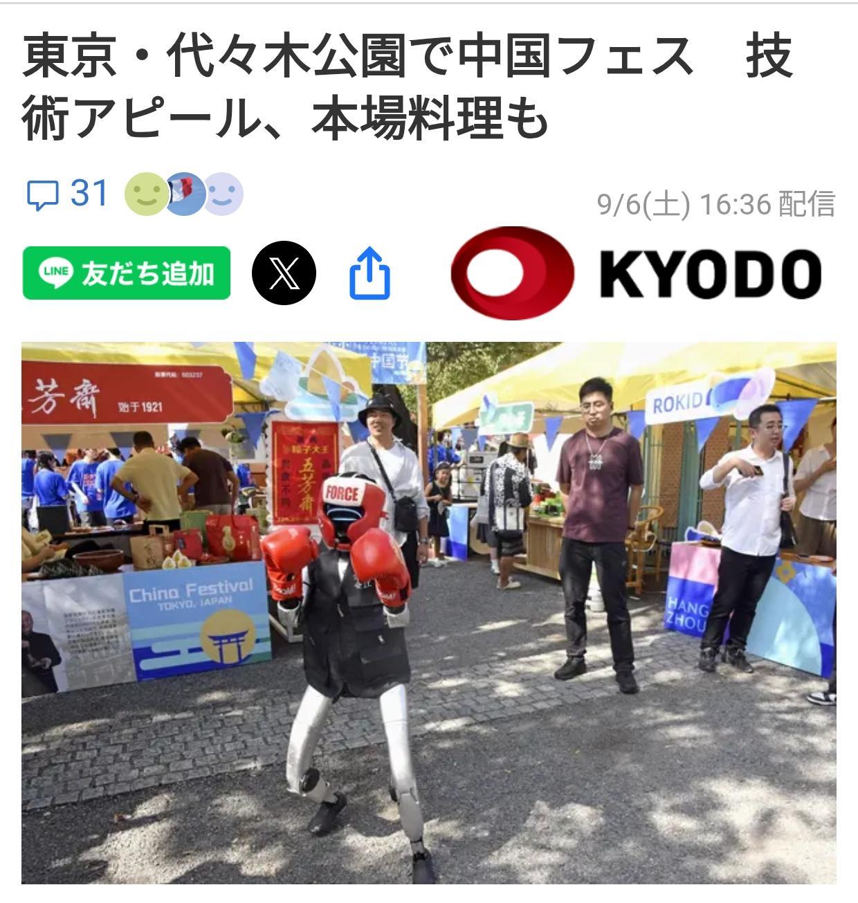 东京代代木公园举行“中国节” 据日本《朝日电视台》、《共同通信社》等媒体9月6日报道:以“中国的现在”为主题的2025 年“中国节”,于 9月6 日在东京涩谷区代代木公园拉开帷幕。 中国企业展出了尖端机器人和电动汽车(EV)来展示最新技术。 “中国节”始于 2017 年,今年是第 6 次。 正宗口味的中餐馆也摆出摊位, 有160多个摊位,包括刀削面、兰州拉面、麻辣汤等中国菜,以及中国象棋体验区。 除了中国当红艺人的表演,还有人形机器人的拳击展示,展示了中国的先进技术。会场挤满了日本人和中国人。 。 担任执委会主席的中国驻日本大使吴江浩在开幕式上表示,“中日关系有复杂的方面,但我愿努力建立稳定的中日关系”。 前首相福田康夫发视频致辞称:“人与人之间的交流对于建设性的日中关系很重要”。