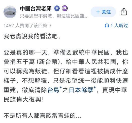 榜样的力量,台湾也有人想学张雪峰,捐款! 几天前,张雪峰在观看九三阅兵后,激动表示若祖国统一之战打响,个人愿捐5000万,公司整体捐1个亿! 万万没想到,此话一出,就如同捅了蟑螂窝一样,网上各路不知道哪来的人马开始围攻张雪峰,行动整齐,似乎背后有只看不见的手在指挥。 更没想到,除了一些个人,还有一些所谓的媒体机构,比如某象,也着急忙慌上阵,攻击张雪峰,可是水平低下,犯了极其严重的原则错误,吓着赶紧自己删了内容,惹得笑声一片。 张雪峰有他的言论自由,清者自清,也树立了榜样。台湾现在也有人愿意学张雪峰,愿意捐5000万台币,合计近1200万人民币,捐给大陆,中华人民共和国。 这位老邱说得特别好,不是所有人都喜欢当青蛙,要实现中华民族伟大复兴!
