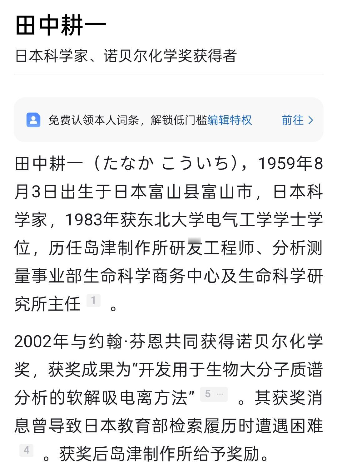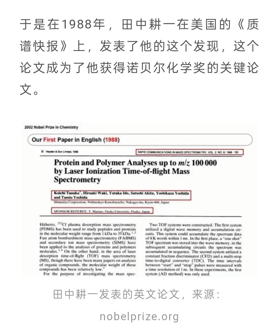 辟个谣:日本的诺贝尔获得者不会英语 现在有一个广泛传播的谣言是日本的诺贝尔获奖者田中耕一不会英语。 事实如何呢?事实是他是因为发表的英文论文而获得了诺贝尔奖。 让我们还原一下: 2002年10月9日下午五点多,日本岛津制作所的职员田中耕一正准备下班,办公室的电话响了起来。田中耕一接起电话,是一个外国人用英语讲话的声音:“祝贺你,田中先生,您获得了本年度的诺贝尔化学奖。” 田中耕一的英语听力不是太好,听得迷迷糊糊的。所以当他稀里糊涂地听到了诺贝尔、恭喜等英语单词后,他觉得这肯定是一个恶作剧,他不失礼貌地答道“谢谢”,随后挂断了电话。 他不是听不懂,而是他当时认为这是一个恶作剧,或者诈骗电话。 田中获得诺贝尔是由于一个偶然的错误。由于他是电气工程师出身,缺乏专业的化学知识,所以田中耕一在研发质谱仪时,一不小心犯了一个“很不专业”的错误。但这个错误,却意外地为他赢得了诺贝尔奖。 有一天,他在尝试测定钴胺素(也就是维生素B12)时,一不留神把丙三醇(甘油)当成了丙酮,作为基质与钴金属超细粉末、钴胺素混合在一起。 田中用激光照射混杂了甘油的钴胺素样品。还没等甘油变干,他就去观测了质谱图,结果看到了生物大分子钴胺素完整的质谱图。这是一个神奇的事情——因为这种生物大分子的质量以前从来没有被测出来过。试验结果表明,那个苦苦寻觅的缓冲剂,其实就是不小心倒错了的甘油。 田中耕一虽然阴差阳错做出了实验,但正如他在诺贝尔奖讲演中提到的那样,因为岛津是一个公司,其实也没有发表学术论文的硬性指标,所以如果他没有发表论文,他也不会得到诺贝尔奖。 1987年,田中耕一参加了中日质谱会议,会议上有一个质谱专家告诉他应该发表他的发现。 于是在1988年,田中耕一在美国的《质谱快报》上,发表了他的这个发现,这个论文成为了他获得诺贝尔化学奖的关键论文。 所以,事实是,田中耕一懂英文,最多是英文听力不太好。 事实上,我与日本人用英语交流过,他们的口语普遍不太好。 但是,他用英文从事科研没有问题,他获奖也是由于他用英文发表的种研论文。 在中国,英语是一种重要的科研工具。听说英语对于科研相关工作有帮助,但是听说不好不影响读文献写论文发邮件。 中国的顶尖大学,都是研究型大学,大学生已经要参与科研了。 许多人对中国英语教育不理解,如果你把英语当做科研的工具来理解。 为什么高考必考,为什么理工科英语更重要,为什么哑巴英语也有用,就有合理的解释了。 诺贝尔 英语