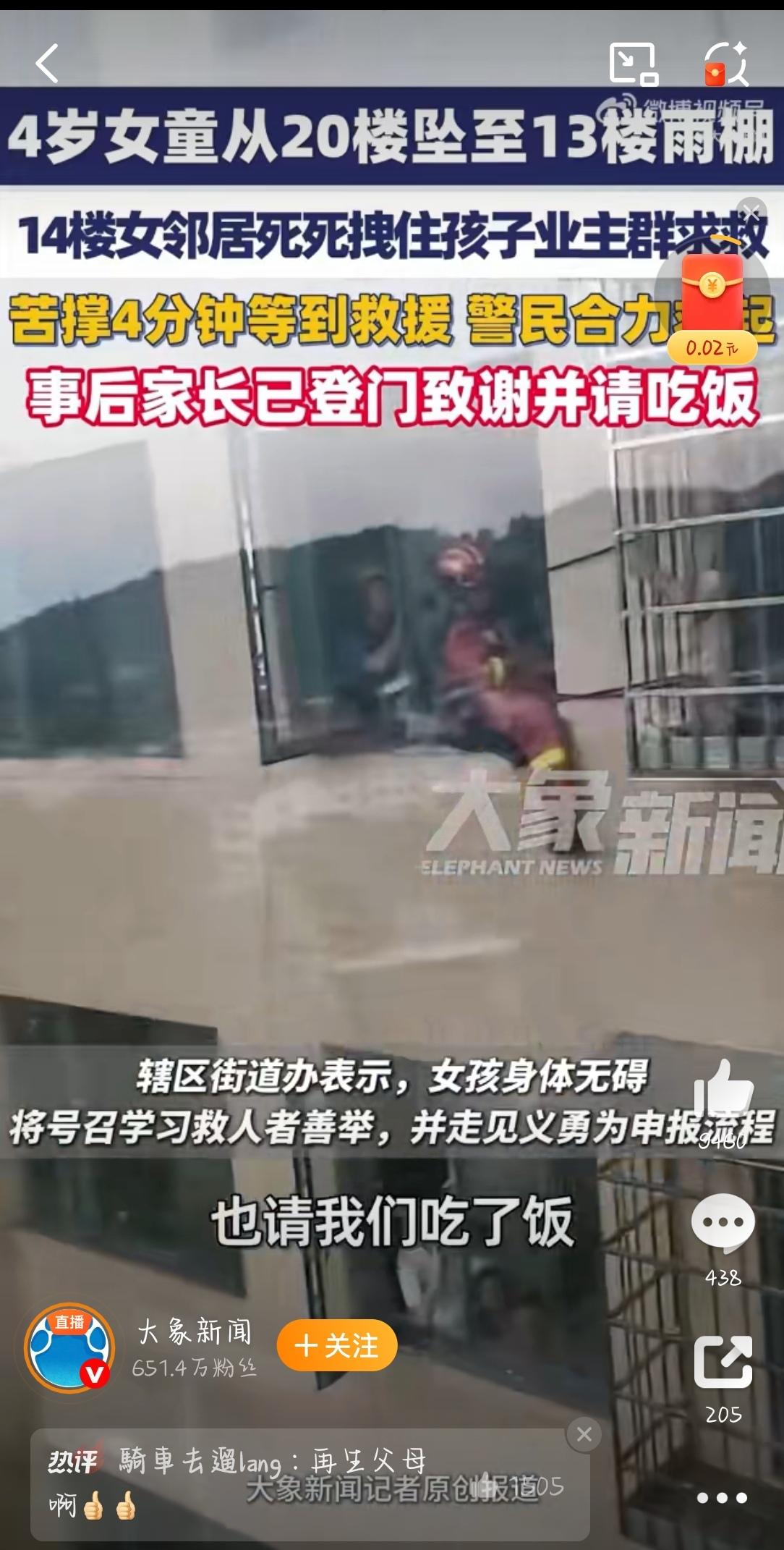 天呐,太惊险了!湖南娄底一名4岁女童,从20楼坠落至13楼的雨棚上,被14楼的女业主吴女士发现,第一时间死死抓住女童的双手,赶紧在微信业主群里紧急呼救,等了几分钟后,邻居与消防员随即赶到救下女童。 事后吴女士自己说,求救的时候声音都在抖,因为怕自己手出汗会抓不住小朋友,等待的几分钟非常着急,好在邻居和消防员到的很及时。 这小孩子也是幸运啊,从20楼掉到13楼被雨棚接住了,又刚好被吴女士抓住,掉了7层都没什么大碍,真是福大命大了,小朋友的家长事后也登门像吴女士道谢。各位家长还是要看好小孩子,有幼童的家庭一定要封好窗户,这么高的楼层真出了事后悔都来不及啊。孩子坠楼