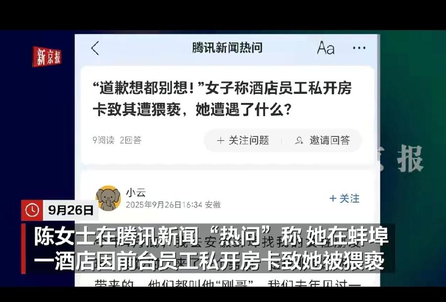 外出住酒店一定要带着防身的东西,进入房间后反锁门,或者找东西抵住门口,一定要保护好自己安全。 今年4月份的时候,一位陈女士在安徽蚌埠南山豪生大酒店入住,结果凌晨三点多,一位男子从前台获取房卡后闯入房间,脱光衣服钻进了陈女士的被窝实施威胁,幸好陈女士是与闺蜜一起住的,后来获救了。 这位男士汪某某后因强制猥亵罪被判刑期9个月,可是他到底是怎么获得房卡的呢?法院查明是汪某某去前台以“朋友醉酒需要照顾”为由骗取的房卡,简直是荒谬,这个酒店在安徽也算得上是高端线,员工培训是怎么做的呢?在没有经过入住本人同意的情况下,居然就这么轻易的把房卡给了其他人,这几年这种事情真的是层出不穷,几乎都是酒店的失误造成的,这次还好陈女士不是自己一个人,万一出现了性质更严重的犯罪酒店要怎么负责? 这次陈女士在网络上发生是要求酒店道歉,出现了这么严重的失职,酒店居然只是在陈女士的社交谋体评论下道过歉,连一篇正式的道歉文书都没有,真是有恃无恐,这样子谁还敢去住啊?没有任何安全保障,出了事连认错的态度都没有,支持陈女士维权,什么无良酒店啊。