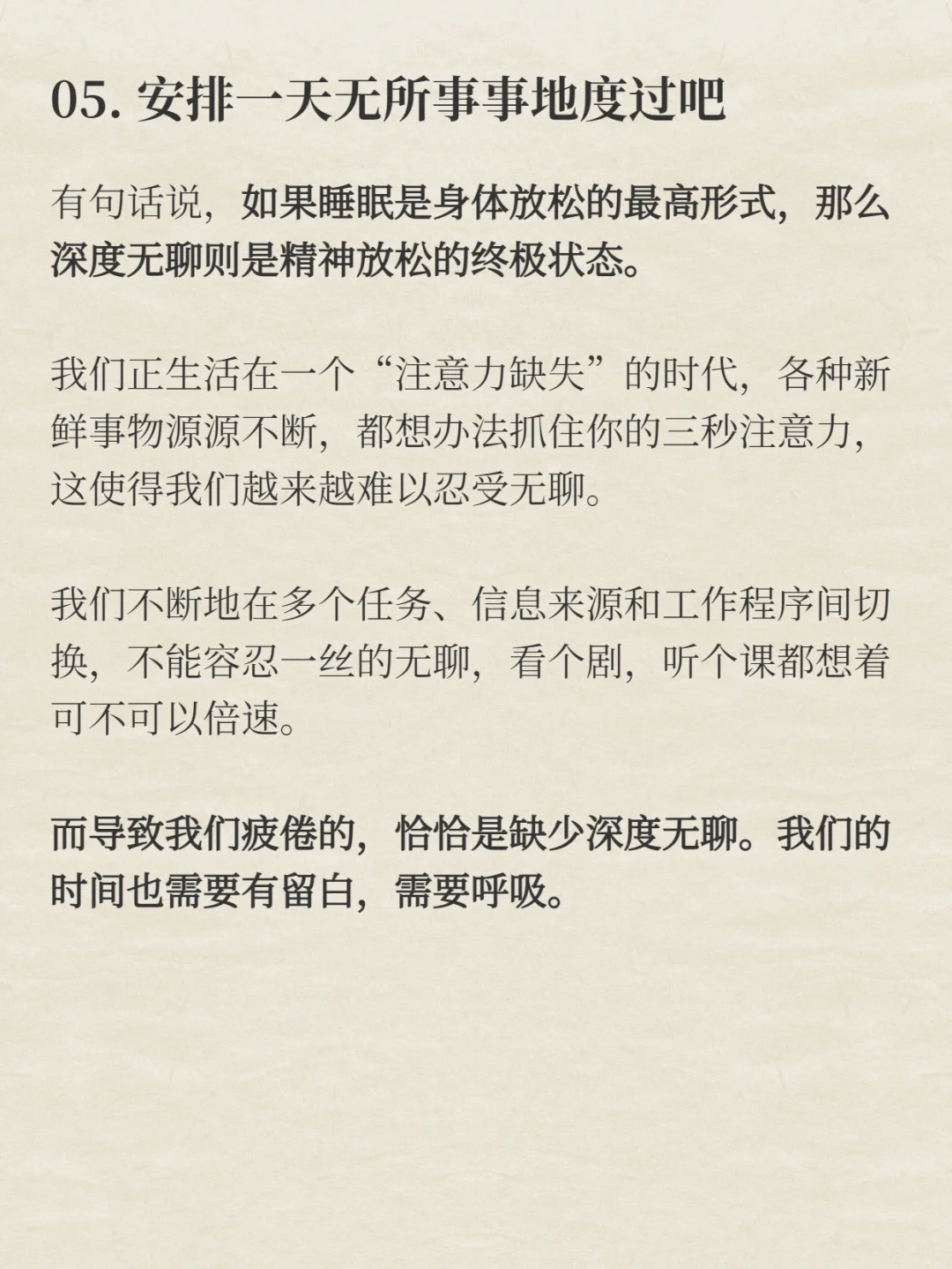 而导致我们疲倦的,恰恰是缺少深度无聊。我们的时间也需要有留白,需要呼吸。