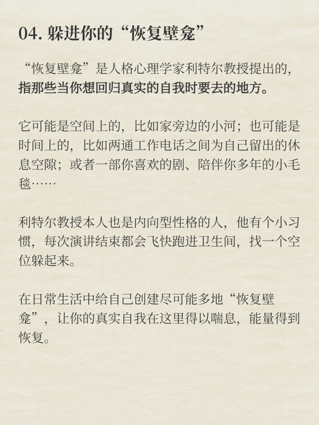 “恢复壁龛”是人格心理学家利特尔教授提出的,指那些当你想回归真实的自我时要去的地方。