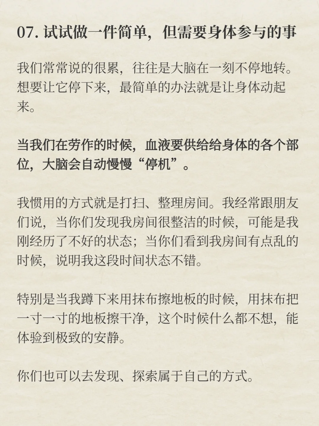 我们常常说的很累,往往是大脑在一刻不停地转。想要让它停下来,最简单的办法就是让身体动起来。