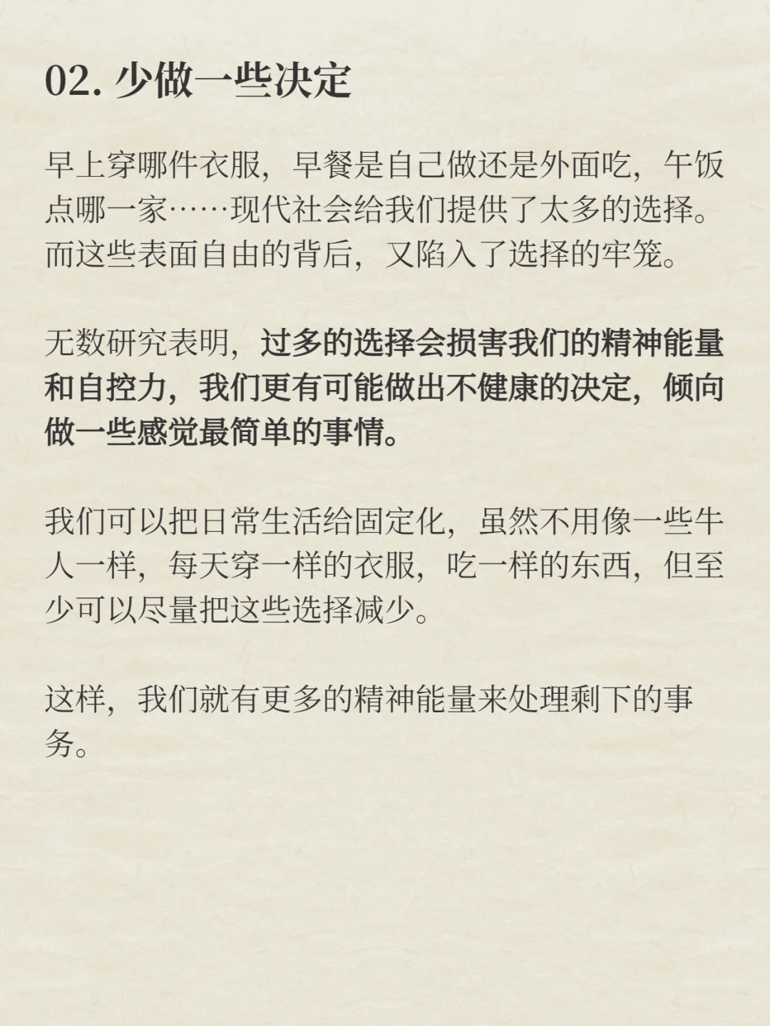 无数研究表明,过多的选择会损害我们的精神能量和自控力,我们更有可能做出不健康的决定,倾向做一些感觉最简单的事情。