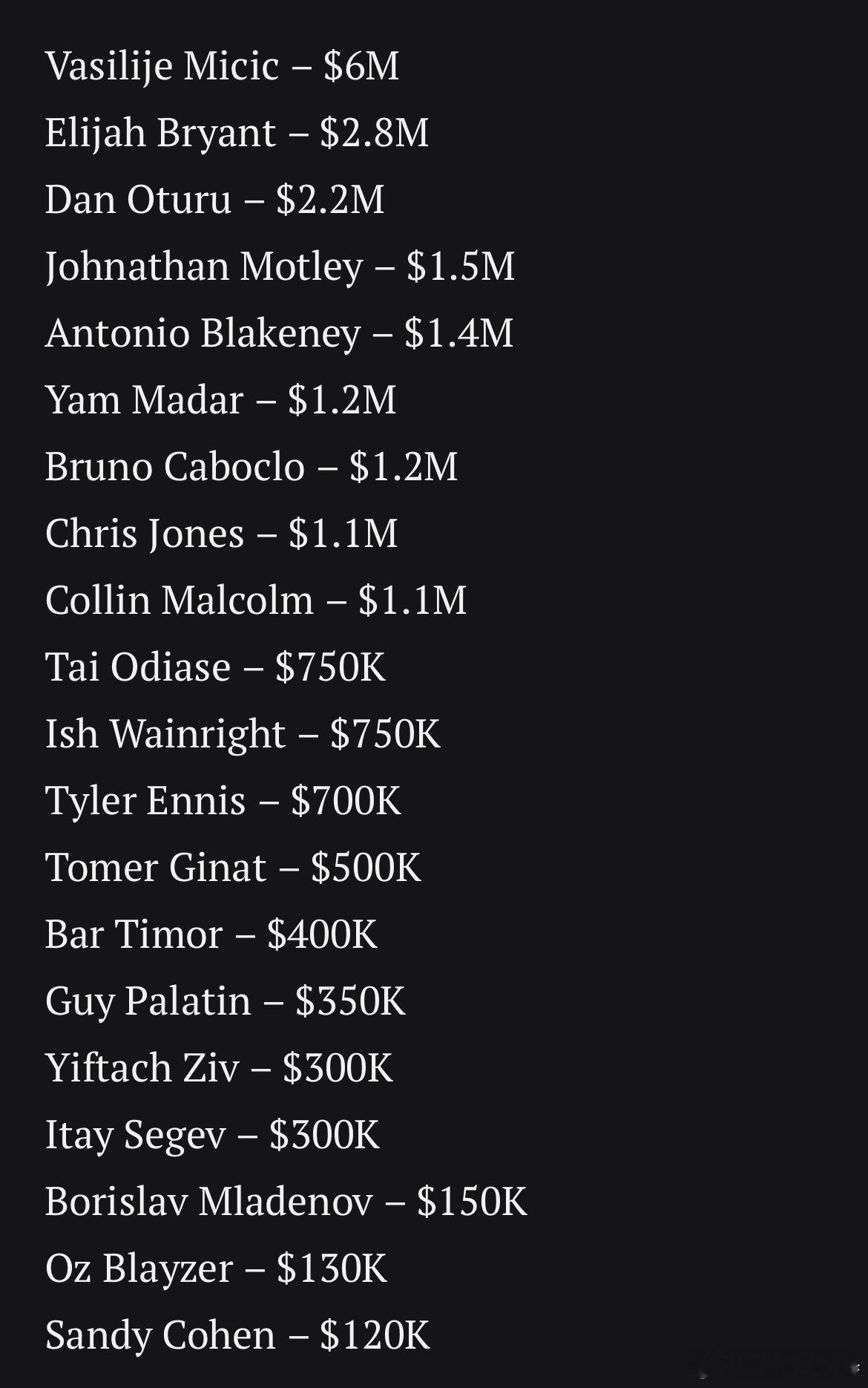 媒体透露的欧冠球队工资表,来自以色列特拉维夫夏普尔:9人年薪超过100万美元,大部分是外援,最高薪的米西奇600万美元,前CBA外援布莱克尼140万美元。本土大部分50万美元以下。