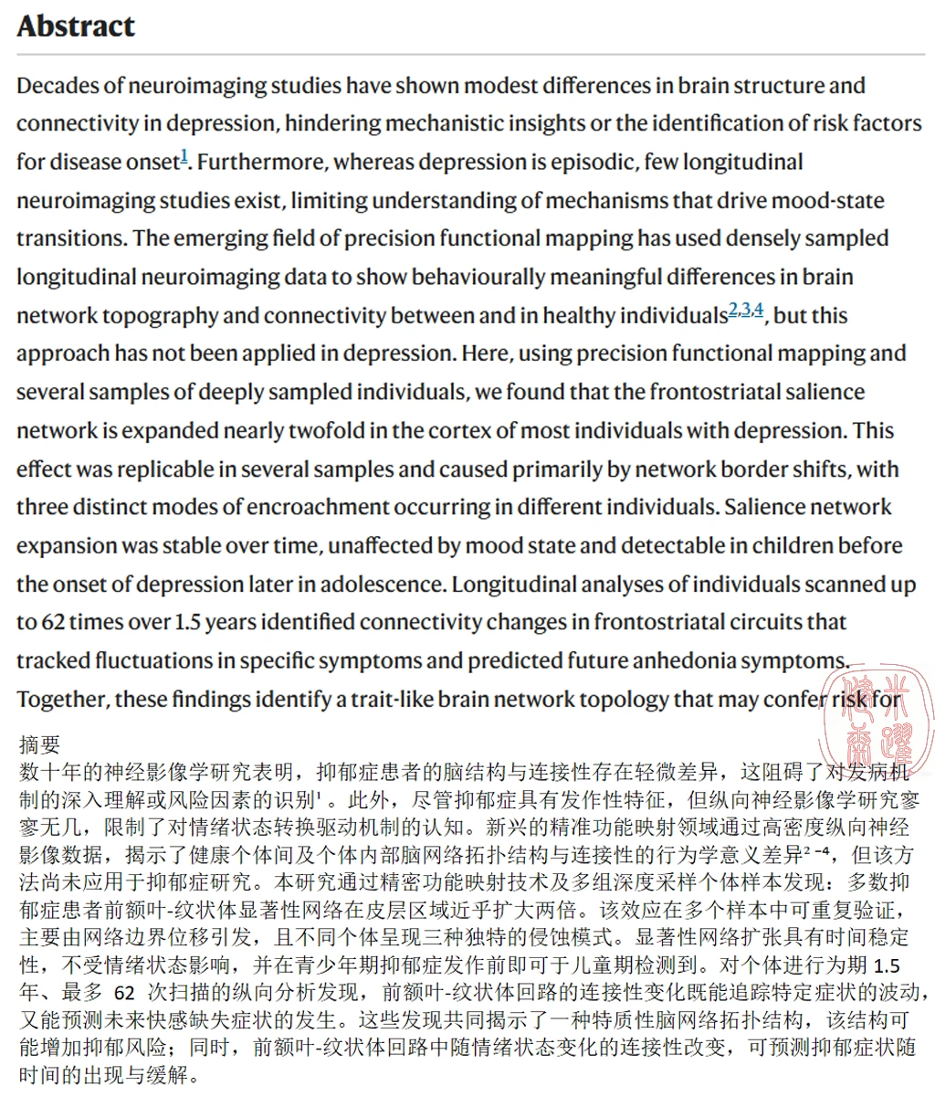 发表在《Nature》上的一项研究,为我们揭示了抑郁症患者大脑中一个惊人的秘密--前额叶-纹状体显著性网络的显著扩张。