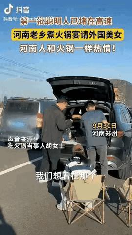 9月30号,郑州高速上车全堵死了,一对中国车主饿得实在扛不住,打开后备箱,支起小