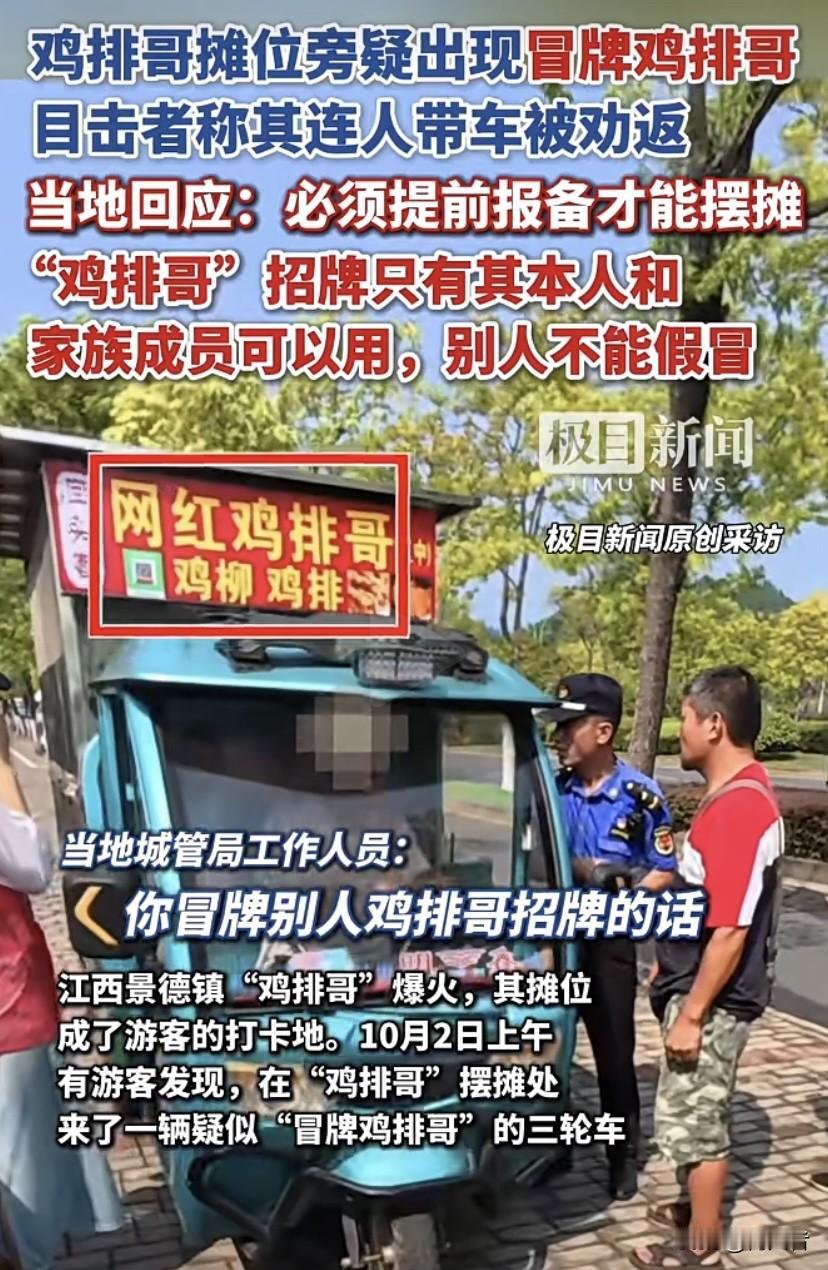 网红鸡排哥摊位旁出现冒牌鸡排哥? 连名字招牌都一样,结果被劝退。 当地回应:必须提前报备才能摆摊 “网红鸡排哥”招牌只有其本人和家族成员可以用。别人不能假冒 只能说这年头,谁都想蹭点流量,做生意都不容易,你觉得呢
