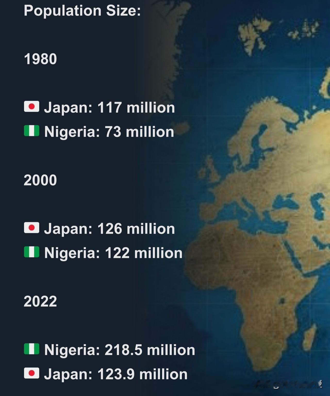发达国家人口下降,发展中国家人口上升! 1980年日本人口1.17亿,尼日利亚7300万; 到了2000年,日本人口增长到1.26亿,尼日利亚人口增长到1.22亿,接近日本。 到了2022年,日本人口减少到1.239亿,而尼日利亚的人口增长到2.185亿,尼日利亚人口几乎多日本多了1个亿。 这就是近几十年来,世界人口变化的基本趋势,那就是发达国家人口出生率急剧下降,老龄化加剧;发展中国家,特别是伊斯兰国家的高人口出生率。 各国人口比例变化对世界政治格局和经济格局必将产生深远影响,值得高度关注。 中国必须引起高度警觉,不要成为下一个日本。