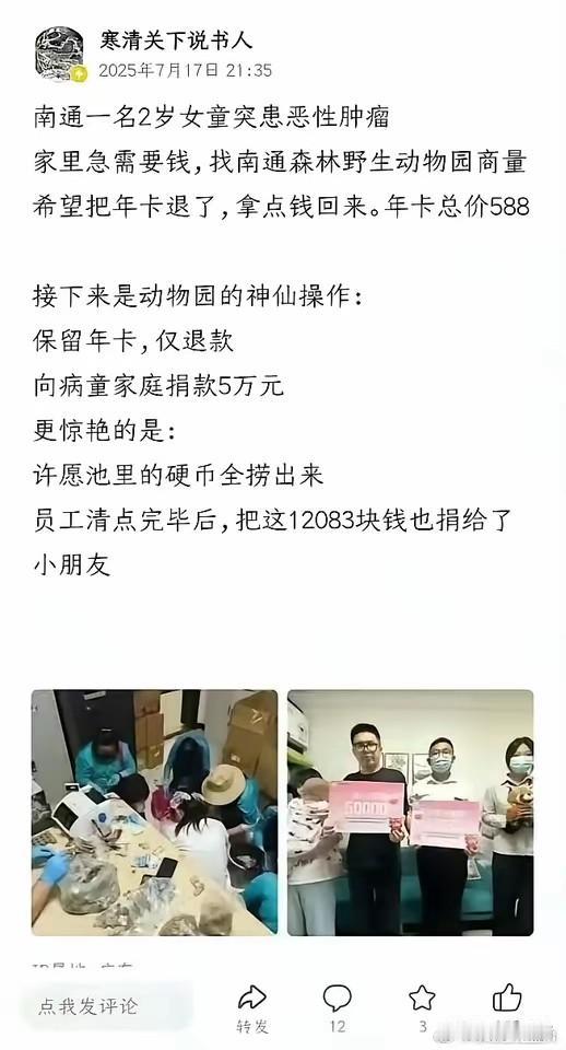 我们南通还是有慈善基因的[大金牙][赞] 我上学那会儿就有“莫文隋”,然后到更大规模的“江海志愿者”。 还有之前听说我们之前习以为常的“电影院不检票”,也是全国仅见。 现在平生仅见的“许愿池”的钱真正做慈善的。[大金牙] 真的为家乡点赞👍,“近代第一城”真正的内核应该就在此! 南通义工 南通公益商家 南通野生物园