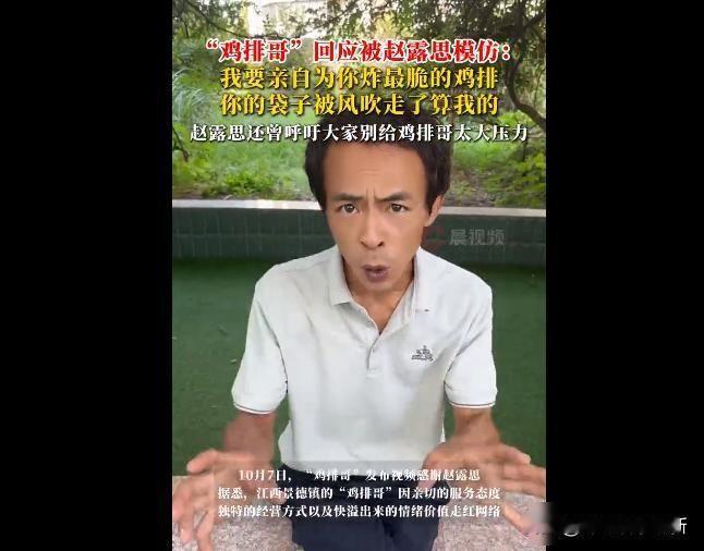 赵露思一句话,鸡排哥火出圈,景德镇等你来吃? 9月30号那天,赵露思在剧组直播时顺口提了一句,说鸡排哥比她还火,管顾客真有一套,粉丝听了就笑,马上转着聊,这事没剧本,没安排,就是她随口一说,结果真就火了。 10月7号,鸡排哥自己拍了个视频回应,没摆架子,也没提广告,就笑着说了句,欢迎来景德镇,我给你炸最脆的鸡排,这话一出来,话题立马冲上热搜,大家觉得他实诚,不装,反而更愿意看,更愿意支持他。 这事儿挺有意思,明星带火地方,以前总得靠拍戏或者代言,这次不一样,是个素人摊主,让明星随口一调侃就火了,赵露思没打算营销,鸡排哥也没想着接广告,她就是顺口夸了一句,他就是真心请人吃了一块,结果观众觉得,这事儿真真实实,挺亲切的。 景德镇本来靠瓷器出名,现在年轻人爱去那儿逛小店,吃夜宵,鸡排哥不是什么大老板,就是街边炸鸡排的小哥,他抖音上有三百多万粉丝,一条视频能有十万以上点赞,赵露思那句话,让他从路边摊变成了城市名片。 有人问谁更火,明星靠流量活着,素人靠日子打动人,赵露思放低身段学他,鸡排哥用炸鸡排回了他,一来一去,观众就记住了这座小城,记住了这家小店。 景德镇不少店都挂上了“鸡排哥同款”的牌子,抖音上相关话题播放量超过两亿,本地文旅号也发帖问,被赵露思点名的人,值不值得你专门跑一趟,这不只是闲聊,是普通人一句话就带动了地方经济的事儿。