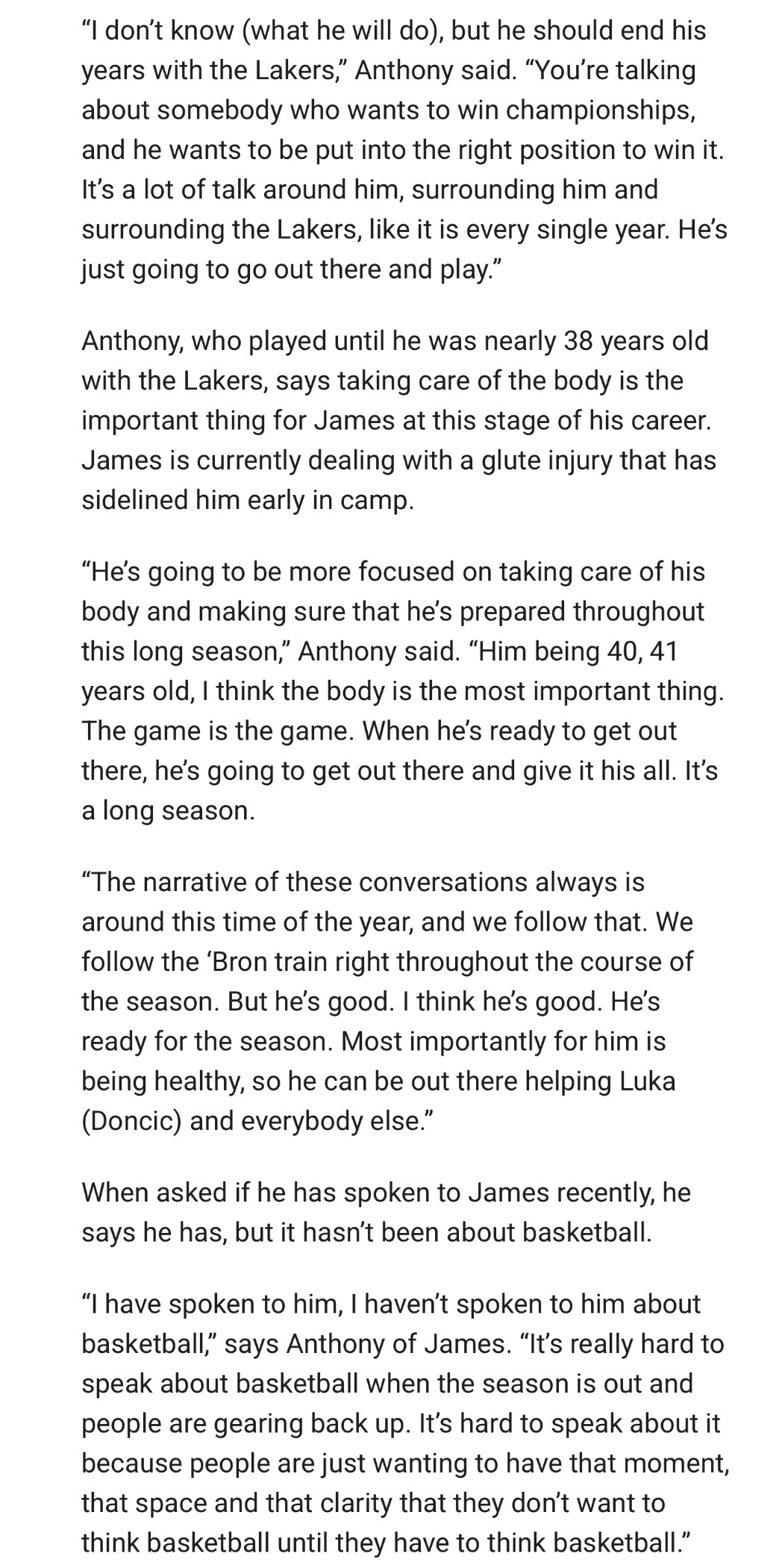 曾在湖人效力至将近38岁的安东尼表示,在职业生涯的这个阶段,照顾好身体对詹姆斯来说是最重要的事情。詹姆斯目前正受到臀肌伤势的困扰,这使他缺席了训练营初期的活动。