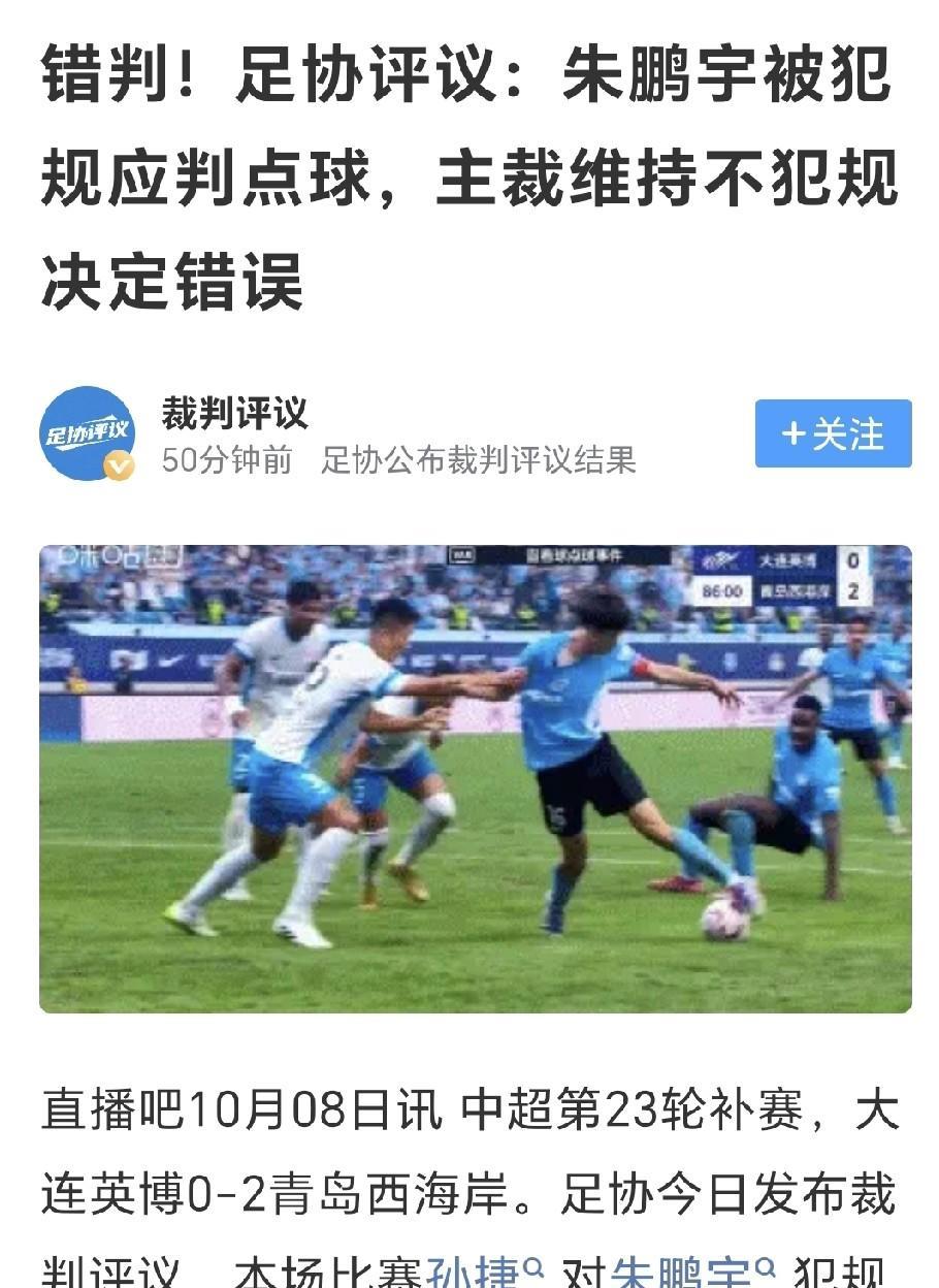 迟到的正义,明眼人都能够看出来这是个点球,就主裁判马运坤假装视而不见,看不出来!中国足协裁判评议报告给出官方结论:青岛西海岸球员孙捷对大连英博球员朱鹏宇的犯规动作应该判罚点球,主裁判孙捷没有判罚点球属于错判。 大连英博吃了哑巴亏,比赛结果已经不能更改!还好大连英博已经提前保级了,要是因为主裁判的错判导致大连英博不能保级那就属于重大事故。 既然已经确定属于错判,那么对主裁判马运坤应该怎么追责呢?应该就是停赛一两场 没有更加严重的处罚手段了! 那么问题来了,您认为如果中超联赛裁判出现明显错判,应该怎么处罚追责?#中超# #中国足球#