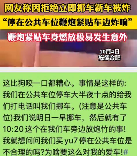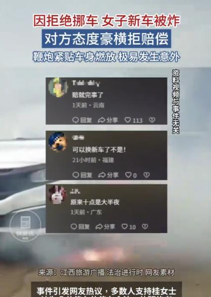 10月3日,安徽合肥,一女子才提的新车,回家时发现车位满了,她把车停在对面路边划线的停车位上,晚上10点,有人叫她挪车,女子认为,车停在公共停车位,在划线之内,没有挡道,也不妨碍进出,现在时间太晚,明天再去挪车,可万万没有想到,过了20分钟,一女子在她新车旁边放鞭炮,哨兵模式紧急提醒,女子赶忙跑去一看,车漆多处受到损伤,女子报警,对方态度豪横,女子将车开去定损,损失将近1000多元,对方不赔,也不道歉,女子将视频发到网上: 大家来给我评评理! 10月3号那天,桂女士(化名)下班早,想着先把新车开回家。到了小区门口,她傻眼了,地下车库和地面车位全满,绕着小区转了好几圈,还是没找到空位。 天也快黑了,桂女士看见小区对面路边划着几个公共停车位,也没看到禁停标志,就把车稳稳地停了进去。 下车仔细检查了一遍:没压线、没挡人行道,旁边车门也能正常开,这才放心回家。 晚上快十点,桂女士刚准备休息,手机响了,一个陌生电话打过来。 电话那头是个女的,语气特别冲:“你是不是把车路边了?赶紧下来挪车!” 桂女士愣了愣,她停的是公共车位,又没挡到谁,这么晚折腾一趟太麻烦,就解释:“我停在划线车位里,没挡道啊,能不能明天一早再挪?现在太晚了。” 没想到对方直接火了:“让你挪你就挪!哪那么多废话?这车位我常用,你占了我停哪儿?” 桂女士心里有点不爽,公共车位本来就是先到先得,哪有“常用就归自己”的道理? 桂女士尽量耐着性子说:“不好意思啊,我明天一早就挪,你要是着急,看看旁边还有没有空位。”说完就挂了电话。 原以为事情就算了,没想到过了二十多分钟,桂女士手机突然弹出“哨兵模式”的警报,她提车时选了这个功能,车周围有动静就会录像提醒。 她心里一紧,赶紧喊上老公往楼下跑。 路灯下,街道静悄悄的,只听到远处偶尔传来的汽车声,她加快脚步下楼,心里越来越不安。 一看气得说不出话:一名女子正站在自己新车旁,地上全是鞭炮碎屑,刚贴的原厂车漆已经被炸出好几个小坑。 “那可是新车啊,连保护膜都没撕完,就被弄成这样!” 她立即报警,民警调取监控后发现,燃放鞭炮的人跟桂女士完全不认识,更别说有矛盾了。 可面对民警询问,女子态度特别嚣张,不仅没道歉,还一副理直气壮的样子,好像自己没做错事。 第二天,桂女士把车送到4S店定损,维修费算下来要1000多元。 她等着对方联系赔偿,可左等右等没消息,主动找过去,对方干脆不理人,既不赔钱也不道歉。 无奈之下,桂女士把手机录下的“哨兵模式”视频发到网上,委屈地求网友评理。 视频一出,网友们全炸了。 有人起初质疑是不是车挡了人家门口,但桂女士放出的监控显示,她停车完全合规。 网友评论:“公共车位本来就是先到先得,深夜叫人挪车不合理,还用鞭炮炸车,这明显是报复。”“这人也太霸道了,真把公共车位当自家地盘了!” 更重要的是,这种行为已经违法。 目前,桂女士已经决定通过司法途径维权,手里的报警记录、监控视频和定损报告都是证据。 钱不是最大问题,关键是心里太委屈:“车停得合规,还没做错事,怎么能被这样对待?” 这件事也提醒大家:公共车位不是私人领地,谁先停谁先用是天经地义的。 遇到停车纠纷,找物业或报警解决就好,别像这位邻居那样用鞭炮炸车发泄,赔了钱还丢了理,得不偿失。 对此你怎么看? 信源:新闻夜航