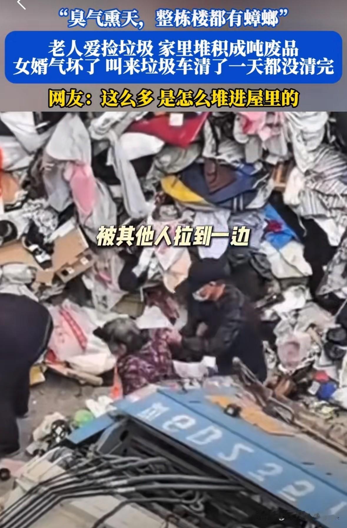 河北一个老太太特别爱捡垃圾,家里堆积了成吨的废品,而且臭气熏天,整栋楼都有蟑螂。 女婿实在受不了,就叫来垃圾车,清理了一天都没有清理完。 清理过程中,老太太多次阻拦,还跟别人动手,不让拉走这些垃圾。都被制止,老太太只能坐在角落里大哭! 捡废品没有错,但是已经影响到整栋楼的卫生,就不行了! 这么多垃圾,这么臭,真不知道你们怎么居住的。扔垃圾乱象