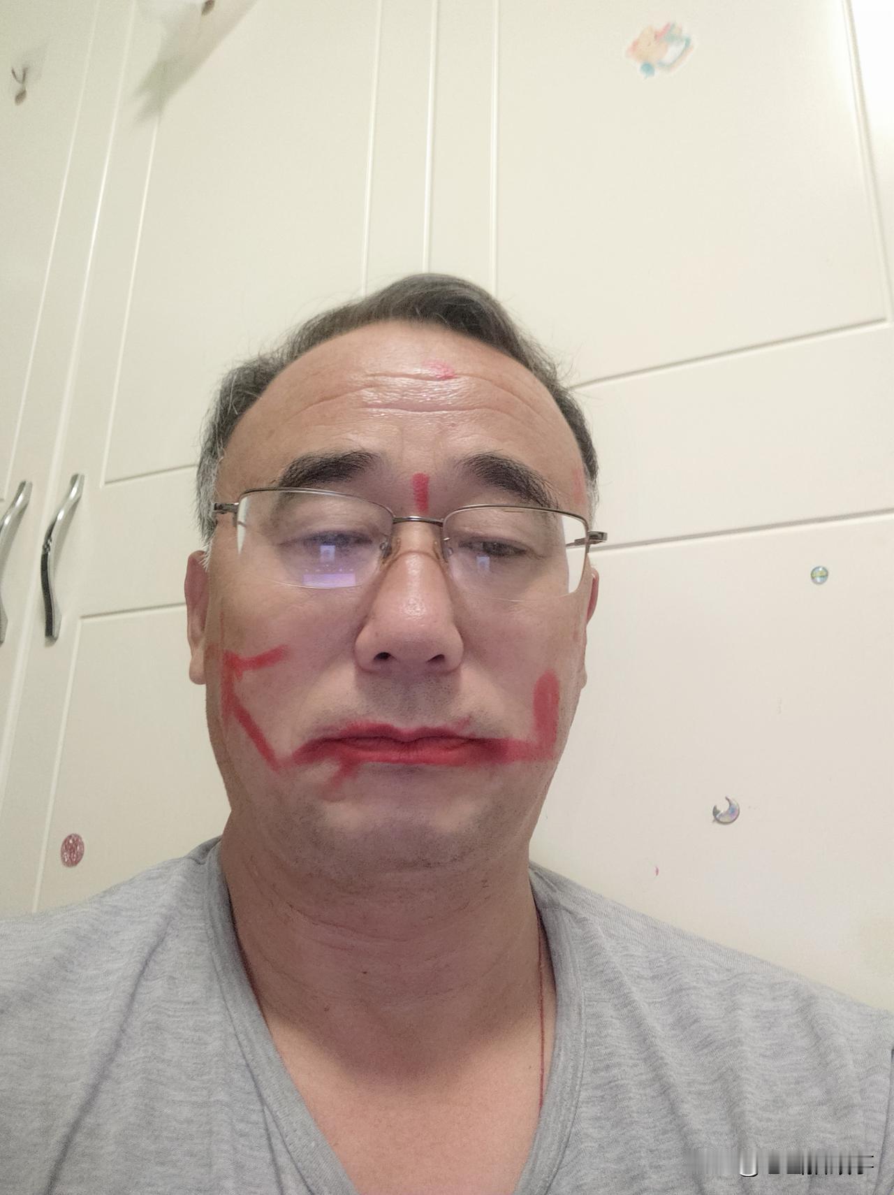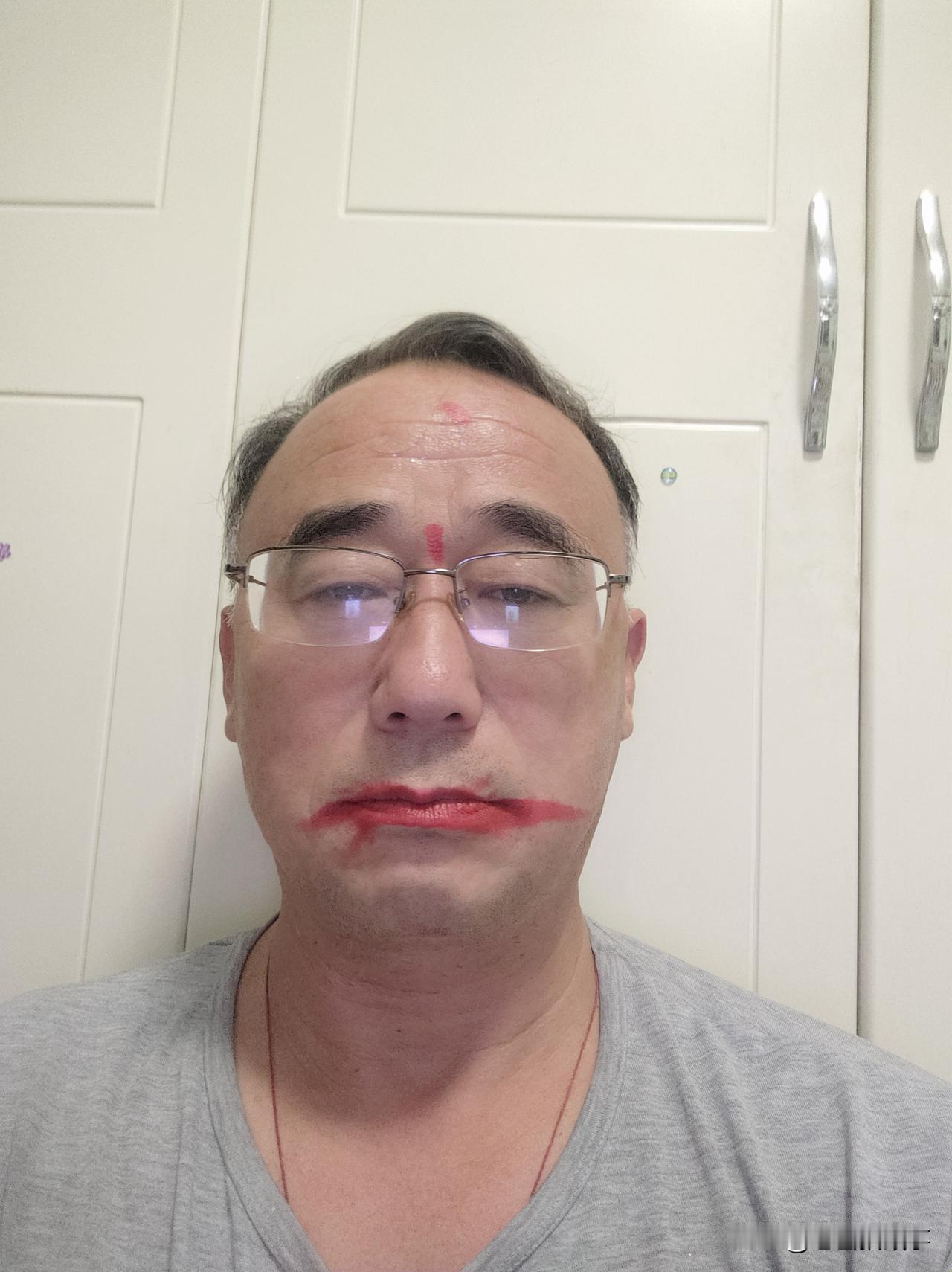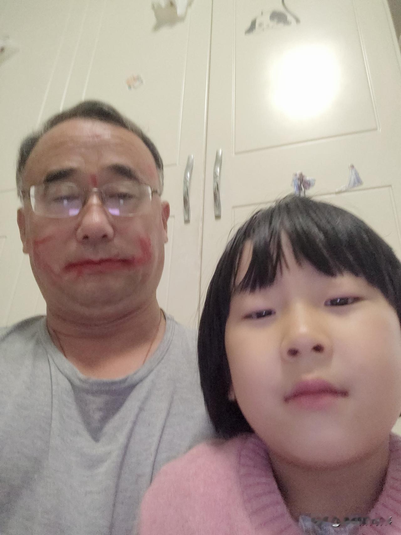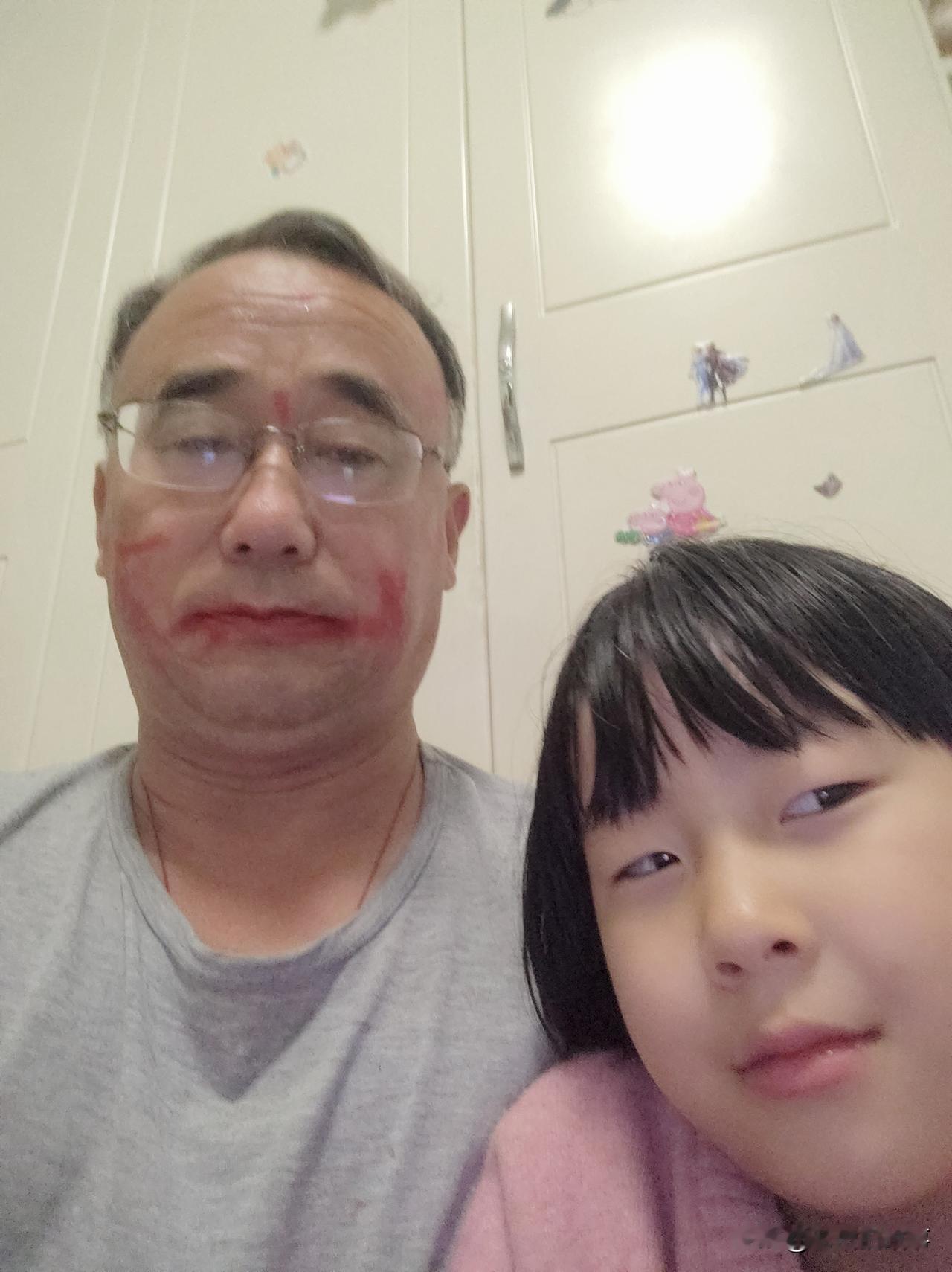 小家伙今天晚上非要给我化妆,说:让姥爷变漂亮!最初化了口红,虽说不合身份,但说的