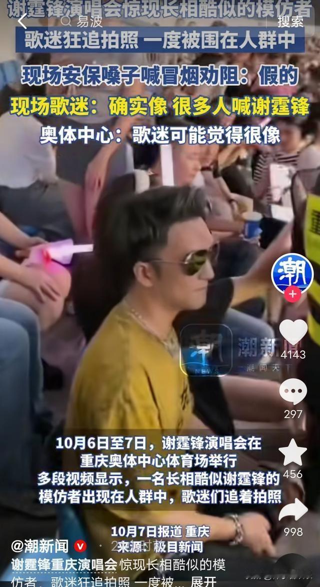 谢霆锋演唱会上的模仿者叫易峰,原名叫易波,曾经是个送快的,凭借三分相似谢霆锋,怒