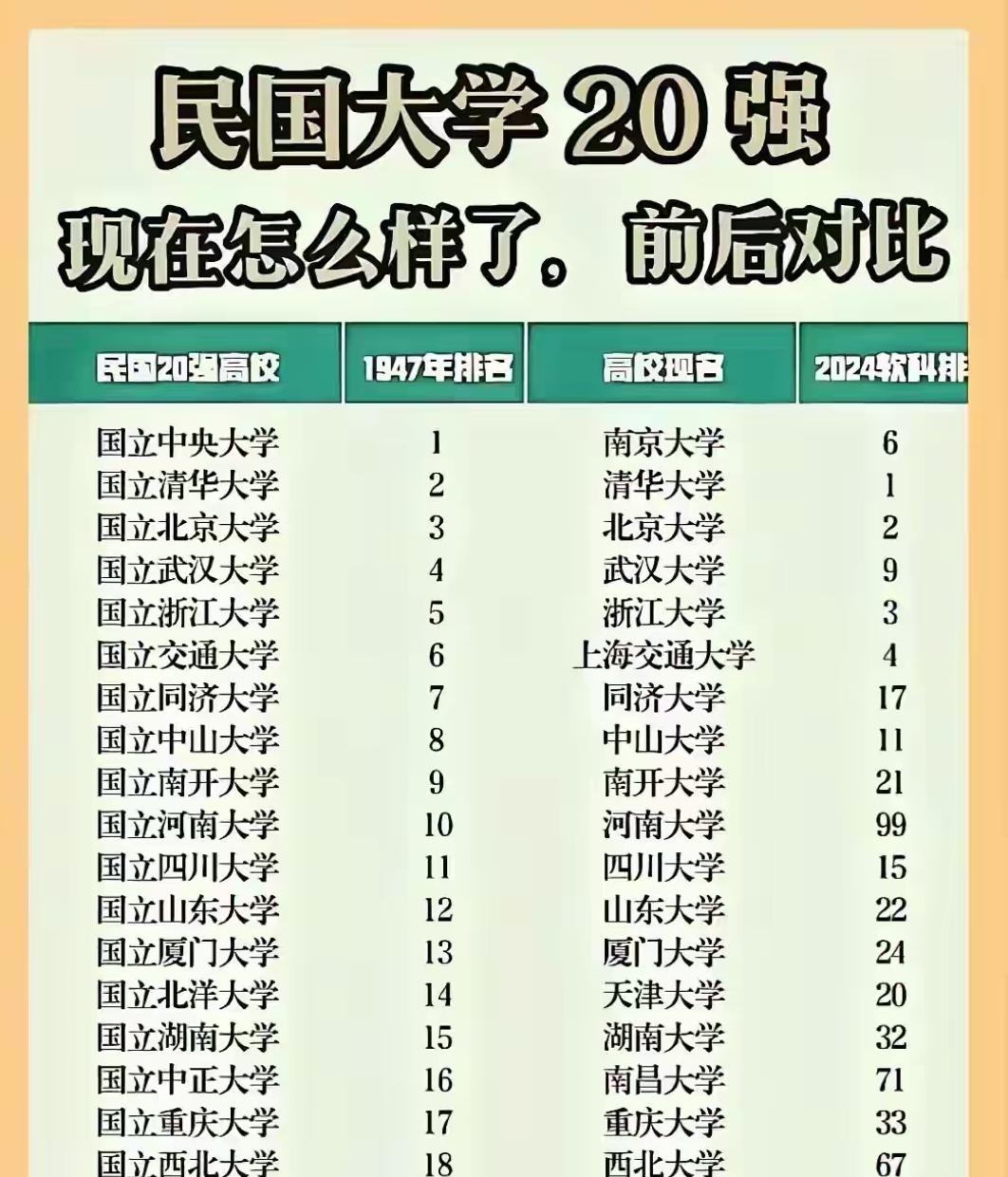 民国大学20强今昔对比:岁月变迁里的名校浮沉,藏着多少教育故事? 翻开1947年的民国大学排名,再对照2024年的软科榜单,恍若穿越了近八十年的时光长廊。那些曾经在民国时期熠熠生辉的高等学府,如今是依然挺立潮头,还是在时代浪潮中悄然改变了模样? 国立中央大学当年以绝对优势位居第一,如今蜕变为南京大学,2024年软科排名第6。这所百年名校的文脉从未中断,在文科、理科领域持续闪耀,依旧是无数学子心向往之的学术殿堂。 国立清华大学从当年的第二,如今登顶软科第一。它在工科、交叉学科领域的突破,让“清华制造”成为顶尖科研的代名词。漫步清华园,那些老建筑与前沿实验室交相辉映,诉说着传承与创新的故事。 国立北京大学稳居第二,它的人文底蕴和学术自由精神,滋养了一代又一代思想者。未名湖畔的书香,从未因时光流逝而淡去。 再看国立武汉大学,当年第四,如今第九。珞珈山的樱花每年依旧盛开,而武大在测绘、遥感等学科的成就,早已走向世界。 国立浙江大学从第五跃升至第三,“求是创新”的校训在新时代被赋予了更多科技内涵,它在人工智能、农学等领域的亮眼表现,让这所百年名校焕发新的生机。 国立交通大学现为上海交通大学,排名第四。它在船舶、机械等传统工科的强势地位依旧,同时在生物医药、金融科技等领域开疆拓土,诠释着工科强校的多元发展。 国立同济大学当年第七,如今第十七。它的建筑、土木学科始终是行业标杆,上海的众多地标建筑里,都有同济人的智慧印记。 国立中山大学从第八到第十一,岭南大地的学术火种在它这里生生不息,医学、商科的进步有目共睹。 国立南开大学从第九到第二十一,虽然排名有所变化,但它在数学、经济等学科的深厚积淀,仍是学界不可忽视的力量。津门的学风,在南开园里代代相传。 国立河南大学当年第十,如今第九十九。这所曾在民国名校中占据一席之地的学府,虽排名有所下滑,但它在中原地区的文化教育贡献,以及对自身历史的珍视,都值得我们关注。 国立四川大学从第十一到第十五,华西坝的医学传奇、江安校区的青春活力,川大在综合发展的道路上稳步前行。 国立山东大学从第十二到第二十二,齐鲁大地的文化底蕴滋养着这所高校,它在文史哲、工科领域的双向发力,展现着综合性大学的担当。 国立厦门大学从第十三到第二十四,鼓浪屿的海风与厦大的文艺气息交融,它的经济学科、海洋学科在国内地位斐然。 国立北洋大学现为天津大学,排名第二十。“北洋”的工科基因在天大身上延续,化工、建筑等学科的实力,让它在工科强校中站稳脚跟。 国立湖南大学从第十五到第三十二,岳麓山下的千年学府,在机械、土木等学科的基础上,正不断拓展新的学科边界。 国立中正大学现为南昌大学,排名第七十一。它在江西的教育引领作用显著,为地方发展输送了大量人才。 国立重庆大学从第十七到第三十三,山城的火热气息融入重大的工科血脉,机械、建筑等学科助力重庆的城市建设与产业发展。 国立西北大学从第十八到第六十七,它在历史、地质等学科的独特优势,为西北的文化传承和资源开发贡献着力量。 还有另外两所(因表格未完全展示),想必也有着各自的发展轨迹。 从这些学校的变迁中,我们能看到什么?是时代对高等教育的塑造,是学科发展的迭代,是地域经济对高校的影响,更是一代代教育工作者和学子的坚守与奋进。有的学校始终站在金字塔尖,有的学校在时代浪潮中调整步伐,有的学校则在特定领域深耕细作。 这些变化,不是简单的排名升降,而是中国高等教育发展的一个缩影。每所学校的故事,都是一段关于理想、传承与变革的叙事。 那么,在你心中,一所大学的“强”应该如何定义?是排名的高低,是学科的实力,还是它对社会、对学生个体的影响?对于这些民国名校的今昔变迁,你又有怎样的感慨呢?