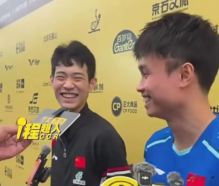 被周启豪笑死了! 原来还有这么这段采访! 周启豪/陈俊松男双打进决赛, 下一场面对王楚钦/林诗栋! 主持人想给他们打打气, 问周启豪: 你最想要的搭档是谁? 说完还瞥了眼旁边的小陈! 周启豪不假思索的说: 那肯定是王楚钦了, 但是想要打败他们, 也太难了! 这么直白, 把陈俊松都逗笑了!