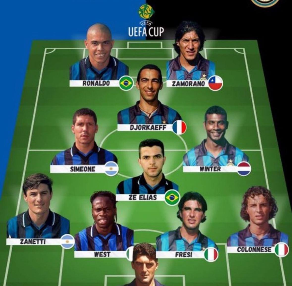 这是国际米兰在1998年夺得联盟杯冠军的主力阵容。这也是罗纳尔多在国米效力时唯一