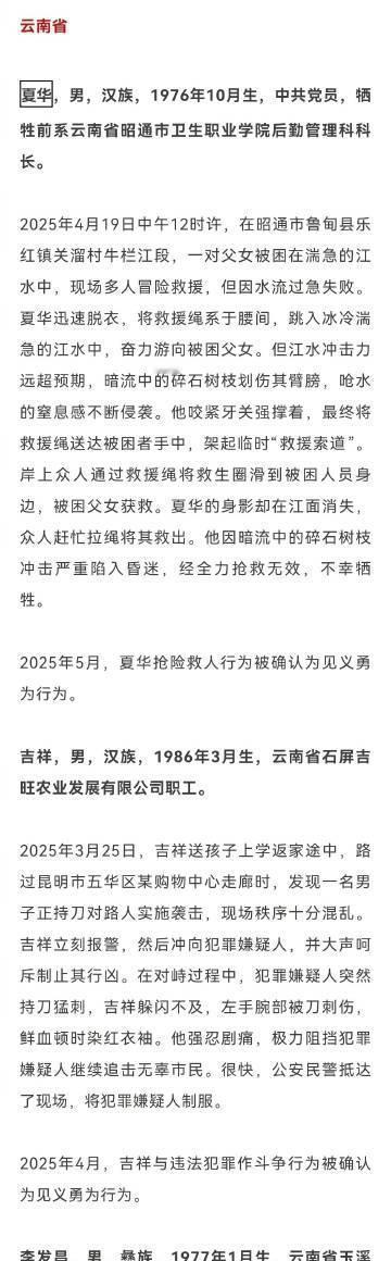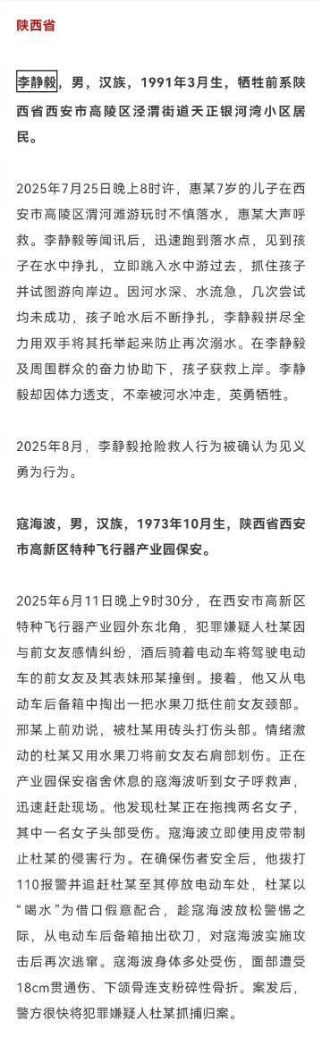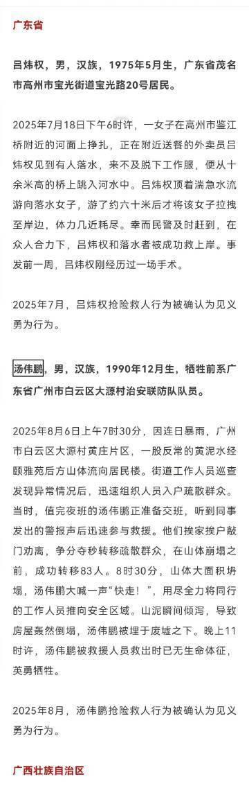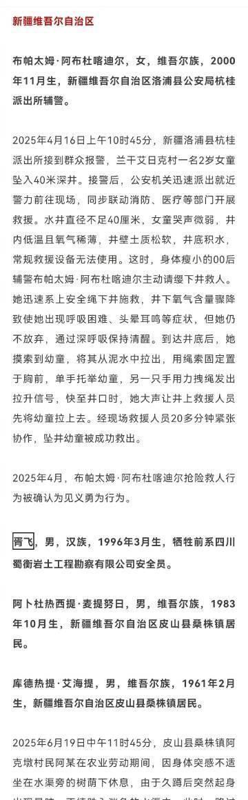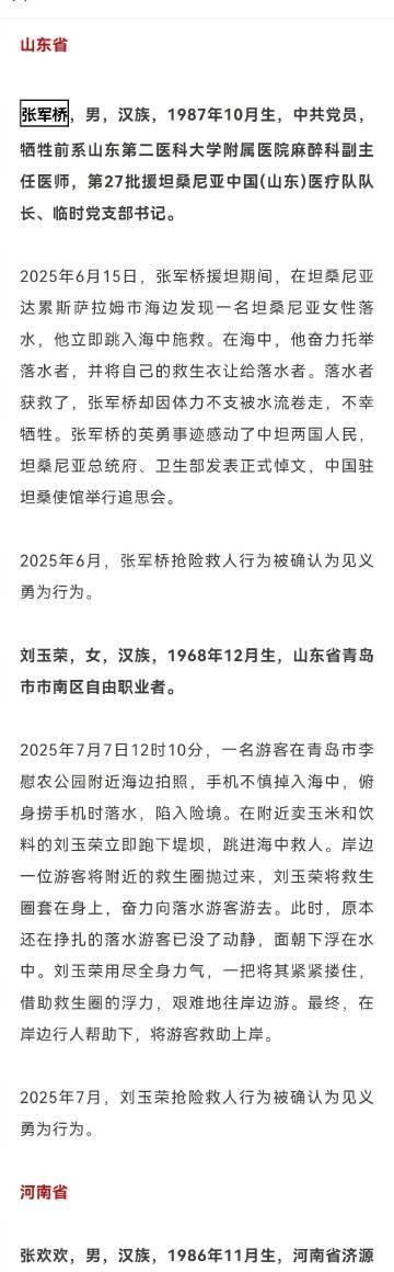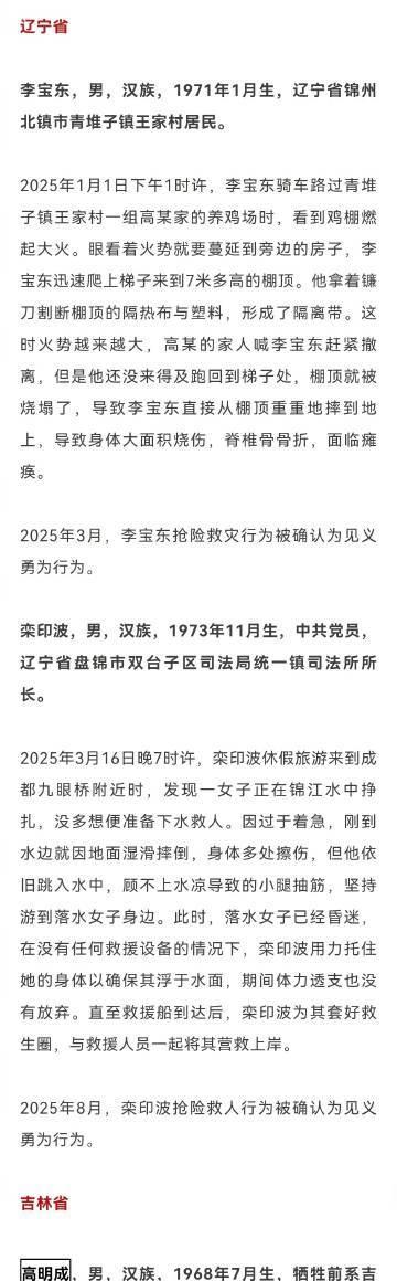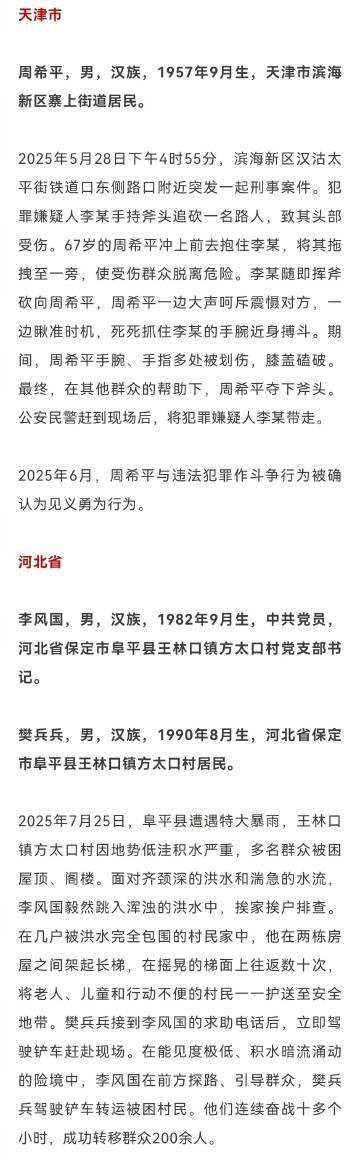 今天,中央政法委发布2025年第二、三季度见义勇为勇士榜,69位见义勇为勇士光荣上榜。其中,有在汛期暴雨洪水中向险而行、抢险救出多人的李风国、樊兵兵、汤伟鹏、朱旭阳等;有在犯罪嫌疑人持刀行凶时挺身而出、英勇搏斗的崔伯风、高明成、许一菡、陈文彬、邹玉华等;有在深达40米低温缺氧井中救出幼童的女辅警布帕太姆·阿布杜喀迪尔;有第27批援坦桑尼亚中国医疗队队长张军桥为施救当地民众英勇牺牲,用生命践行中非人民友好精神。向他们致以崇高敬意!(总台央视记者冀成海)