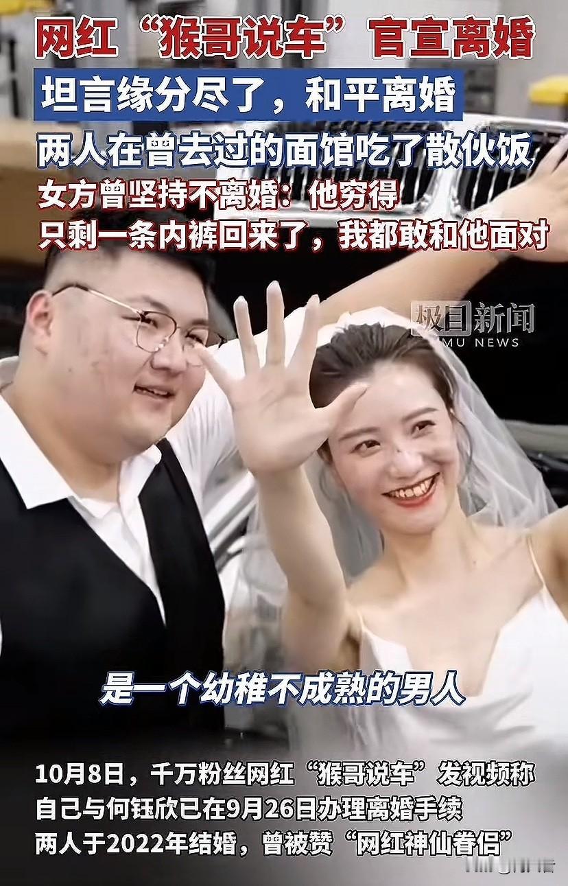 千万粉丝网红“猴哥说车”离婚,简直让人惊掉下巴!2022年官宣结婚时,那可是被赞为“网红神仙眷侣”。谁曾想后来状况如洪水般泛滥,先是“猴哥”线下二期车库破产,经济压力大得能把人压垮,感情也亮了红灯。 何钰欣起初坚决不离婚,还称他穷得只剩一条肉裤回来都敢面对。可“猴哥”总逃避问题,用工作麻醉自己。何钰欣给过机会,他却全然不顾。10月8日官宣离婚,当天还去初见面的面馆吃“散伙饭”。“猴哥”说自己幼稚没担当,网友都觉得这觉悟来得太迟。也有人怀疑他们借离婚捞钱,真让人一头雾水!