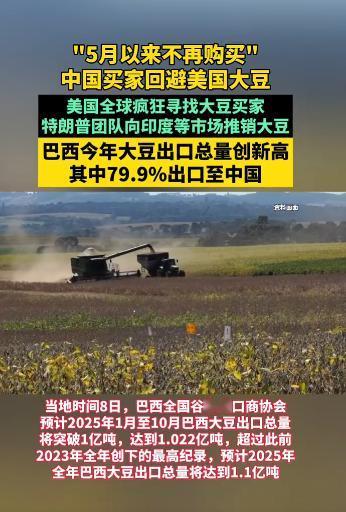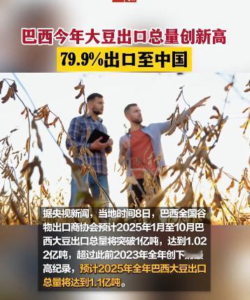10月9日,巴西全国谷物出口商协会发布消息:前十个月大豆出口已突破1.022亿吨,创历史新高!协会还预计,今年全年出口有望达到1.1亿吨,将2023年的成绩远远甩在身后。 里约热内卢时间10月9日,巴西全国谷物出口商协的新闻发布会刚结束,南部巴拉那瓜港的码头就传来货轮的长鸣。 金黄的大豆像流淌的金沙,顺着传送带涌入40万吨级巨轮的货舱,这些即将驶向中国的粮食,正是新纪录的鲜活注脚。 前十个月1.022亿吨的出口量,不仅刷新历史,更把2023年8500万吨的成绩远远抛在身后。 这串亮眼数字的背后,是巴西农业的多年蓄力,更是全球大豆贸易格局的悄然洗牌。 巴西能交出这份成绩单,绝非偶然。 美国农业部2024年12月的报告早有预判,2024/25年度巴西大豆种植面积将扩至4700万公顷,产量达1.65亿吨,为出口爆发埋下伏笔。 在中西部马托格罗索州的农场里,农户们最有感触。 该州农业经济研究所2025年2月的数据显示,当地大豆平均产量预计达每公顷62.07袋(每袋60公斤),换算后约3.72吨/公顷。 比去年同期提升19%,这得益于耐热带气候的改良品种推广和气候条件利好。 加上今年主产区没遇上大的旱涝,地里的收成比去年多了近一成,仓库早早就堆得满满当当。 但光种得多还不够,物流的升级才让这些大豆能顺利“出海”。 桑托斯港作为巴西最大的粮食出口门户,正通过码头扩建和设备升级提升效率。 管理方透露,港口已新增专业谷物码头,部分区域的大豆装卸时间已从三年前的一周缩短至三天。 更关键的是,中国参与改造的港口设施和新建的巨轮航线,把巴西到中国的单位运输成本压低了15%,就算海运距离更长,价格也能跟美国大豆比拼。 巴西大豆的“目的地”里,中国的名字格外醒目。 ANEC的数据显示,今年前十个月,巴西每出口100吨大豆,就有近80吨流向中国市场。 9月更是夸张,650万吨出口量里93%都被中国包圆了。 这背后是实打实的民生关联,在山东日照港,刚靠岸的巴西大豆卸货后直接送往油厂,机器轰鸣中,豆油被装进印着“非转基因”的油桶,豆粕则运向周边的养猪场。 中国每年要吃9000万到1亿吨大豆,老百姓菜篮子里的豆腐、厨房里的豆油,甚至菜市场的猪肉,早就和南半球的农田绑在了一起。 值得一提的是,中粮集团今年还完成了中国首单“零毁林”巴西大豆进口。 这批从巴卡雷纳港出发的大豆,全程可追溯种植源头,避免了毁林种植的环保风险,成为中巴农业合作的新亮点。 不过中国买家也有自己的“算盘”,10月以来,巴西大豆报价比美国大豆高了24美元/吨,不少油厂就放缓了采购节奏,10到12月的船期订单至今没敲定。 这种价格敏感度,恰恰说明中巴大豆贸易不是单向依赖,而是相互牵制的共生关系。 中国买家的转向,直接让美国大豆尝到了苦果。 USDA2024年12月的供需报告显示,2024/25年度美国大豆出口预估为4967万吨。 但由于中国采购量锐减,仓库里堆满了没卖出去的大豆,不少农场主只能降价甩卖。 要知道几年前,美国大豆还能和巴西分庭抗礼,如今却眼睁睁看着市场份额被南美对手抢走,这种变化背后,是贸易政策和市场选择共同作用的结果。 贸易格局变了,金融玩法也在跟着改。 2025年5月,在中国和巴西国家领导人的共同见证下,两国央行续签了1900亿元人民币/1570亿巴西雷亚尔的本币互换协议。 协议有效期五年,这为大豆贸易的本币结算提供了坚实支撑。 现在巴西大豆贸易用人民币结算的比例越来越高,中粮国际等企业早已习惯用本币完成交易,不用再频繁兑换美元,大大降低了汇率风险。 更贴心的是,中粮国际还在巴西建立了完善的大豆可追溯体系,通过土地监测和农户培训,实现了直接采购大豆的100%源头可查,让中国消费者吃得更放心。 但巴西的风光里藏着隐忧,USDA的报告虽未明确巴西2025年期末库存具体数值。 但指出其库存处于历史低位,库存用量比很可能不足3%,远低于5%-8%的国际安全线。 要是明年主产区遇上极端天气,供应立马就得紧张。 更棘手的是,大豆占了巴西出口总收入的16%,近八成又都卖给中国,一旦中国需求降了,巴西农业很可能受重创。 巴西靠产能和物流站稳了脚跟,中国用庞大的市场稳住了供应,美国则在贸易博弈中失去了阵地。 这种中美巴三方的贸易与金融互动,早已超越了简单的“买豆子”生意,它重塑着全球供应链,也改写着未来的粮食安全规则。 而那些驶向中国的大豆巨轮,载着的不仅是粮食,更是三国之间复杂而深刻的利益纽带。 信息来源:央视新闻2025-10-09发布:巴西今年大豆出口总量创新高