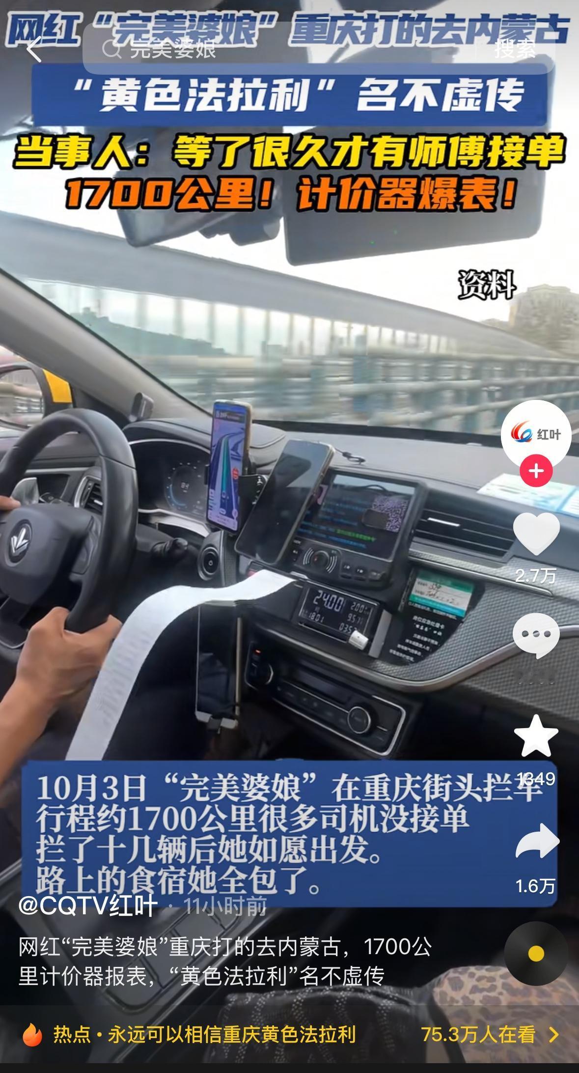 “完美婆娘”真的太酷啦! 国庆假期, 重庆自媒体博主“完美婆娘”突发奇想, 要搭出租车去1700公里外的内蒙古策马奔腾。 3日下午, 她在沙坪坝街头拦车, 好多司机一听去内蒙古, 直接拒绝。 毕竟这行程可不近。 不过, 她如愿出发。 出发前她就和师傅商量好, 路上食宿她包。 第一天到陕西延安, 接着经过榆林, 5日抵达鄂尔多斯, 她也在景区体验到了“策马奔腾”。 一路上, 他们这“黄色法拉利”回头率超高, 还有司机好奇为啥不坐高铁。 这场说走就走的旅行, 太让人羡慕啦!