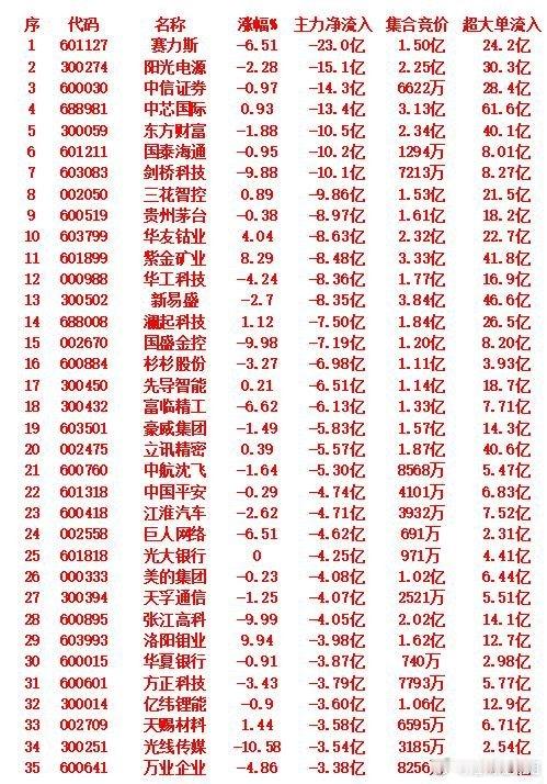 10月9日尾盘,主力资金大幅卖出的35名单!