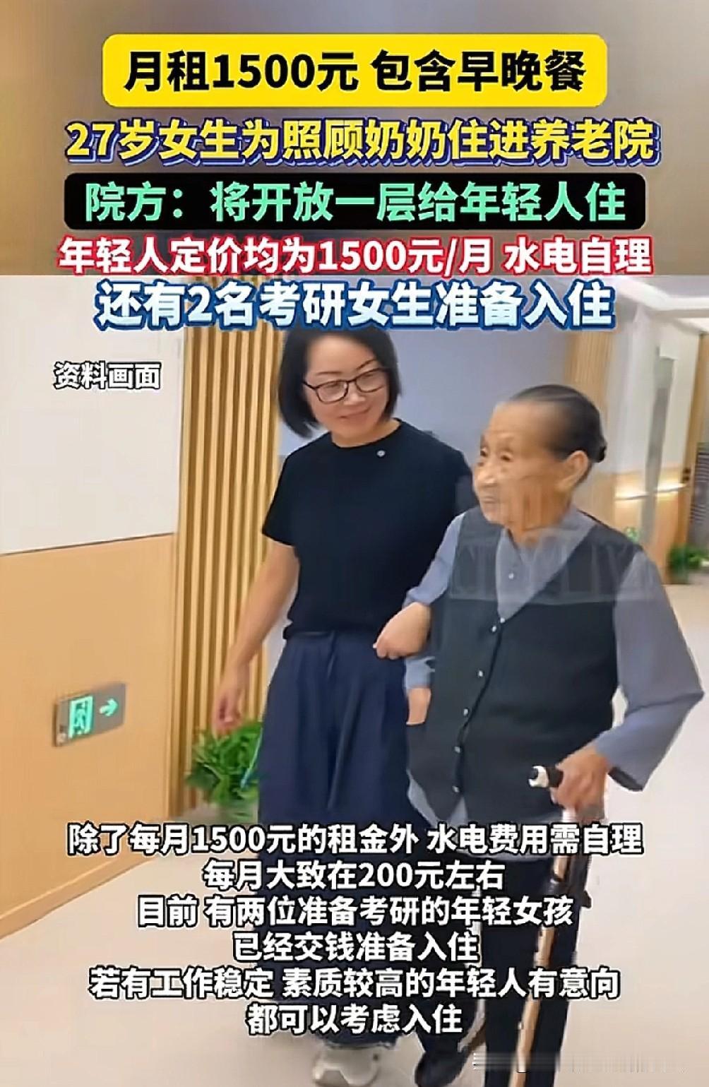 当大家还以为年轻人住进养老院是段子,浙江乐清27岁女生,已经和奶奶一起住进了养老院,这里不仅包吃包住,而且价格还便宜一个月只要1500块。 这个提议还是女生奶奶想的,觉得女生自己太辛苦,还不如和自己一起住进养老院,而且养老院环境还好,同时还可以照顾奶奶,女生的单位离养老院比较近,女生就同意了。 在和院方商量后对方同意,每个月只需要1500,包含了早饭和晚饭,水电费自己交,这样算下来一个月还不到2000块钱, 现在这个物价,2000块钱找个满意的房子都困难,养老院生活作息规律,晚上八点就关门了,晚上回来晚了给保安打个电话请保安开门就行了,这可能就是唯一的缺点了。 目前出了女生意外,还有两位考研的女生知道后也报名了,钱也交了,对此养老院也想试试这种模式的可行性。 有十多位年轻人打电话咨询了,养老院有六层,打算拿出一层给年轻人,不过养老院要求稳定工作,素质较高的年轻人优先考虑。 这种方式对现在的年轻人来说简直就是福音,不用做饭,不用担心饭菜不卫生,还不用打扫卫生,还不用担心自己被影响,老年人一般睡的都比较早,影响的也只有年轻人自己。