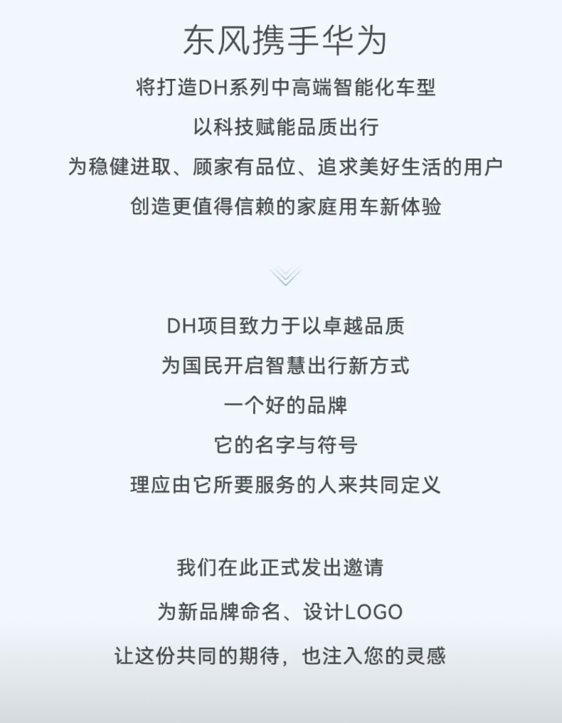 华为引望模式第二品牌呼之欲出,东风奕派与华为合作将推出全新品牌! 根据东风奕派官方消息,奕派公开征集DH项目品牌名和LOGO,给出的示例就是“X境”,这意味着它将是华为境字辈的第二个! DH系列是奕派与华为合作的新品牌,它定位中高端智能化车型,预计将会跟广汽华望的启境品牌一样,DH新项目除了搭载华为最新技术外,还将采用华为IPMS管理体系,在智能化、生态和品牌协同等方面,深度融合奕派科技与华为的各自优势!