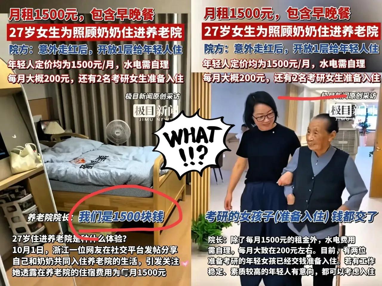 浙江一27岁女生为照顾奶奶, 和奶奶一起住进养老院, 月租金1500元还包早晚餐,关键 离公司近,上班超方便。 别光盯着低价房租和现成饭菜,这事儿的精髓是“双向治愈”。 年轻人愁高房租,养老院愁空置率,凑一起刚好盘活资源。 更妙的是代际互补,老人缺陪伴、不会用手机,年轻人缺安静环境、需要生活烟火气,这不比硬造“养青院”靠谱? 所谓“养青院”不是噱头,是把闲置空间变成情感枢纽。 杭州、荷兰早有先例,证明这种共居比单纯租房有温度。 你说,要是你家附近有这机会,会带着耐心住进去吗?