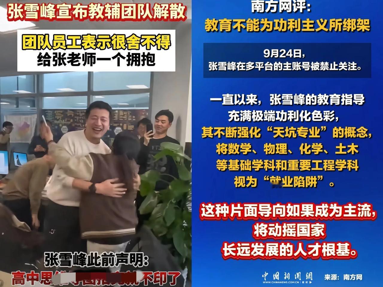 张雪峰老师宣布教辅团队正式解散,但是员工还是依依不舍,给张雪峰老师大大的拥抱! 张雪峰老师账号被禁,确实是违反了规则,官方没彻底封禁算给他留面子了! 这几年他直播讲八大专业知识,影响不少家长给孩子填志愿,高校专业设置都受了影响,还被指贩卖焦虑! 有人说他直播卖课赚上亿元,把家长当韭菜割,功利性太强遭人骂! 但也有网友觉得他为普通孩子发声!! 咱得说,志愿填报本就复杂,张雪峰的影响有利有弊! 张雪峰宣布教辅团队解散,员工表示很舍不得,给张老师一个拥抱!张雪峰 大家觉得张雪峰老师的做法到底是对是错?来聊聊你的看法呗。