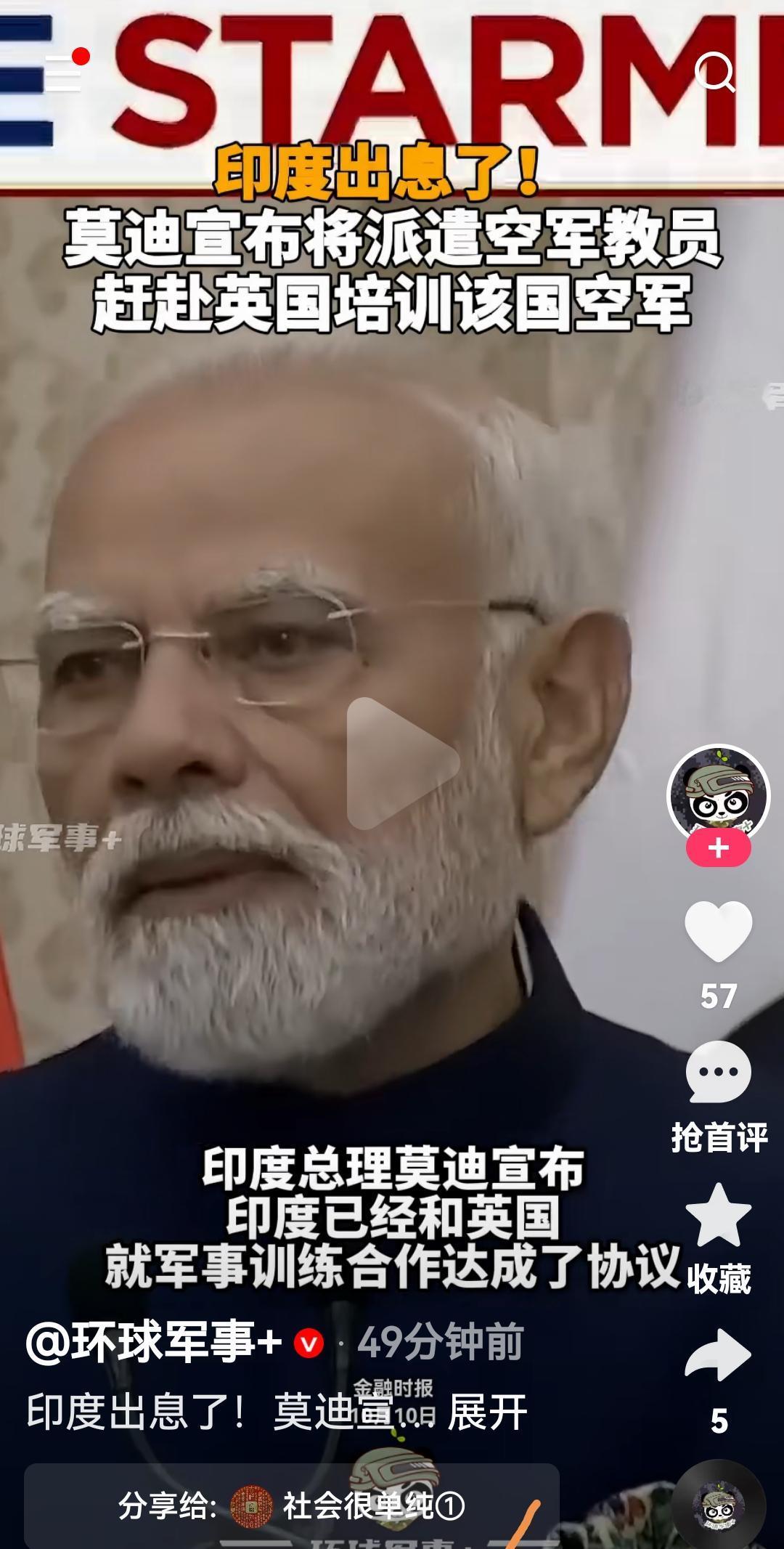 印度认真了吗?三哥要学习了吗 根据印度媒体报道,莫迪宣布印度已经和英国军事合作达成协议 印度空军飞行官将在英国皇家空军担任教练,同时派印度飞行员到英国进行训练,培训,一洗雪耻 三哥这是要学习了,怎么感觉要起飞了 不在刷摩托了,以后三哥要耍飞机了 莫迪这是痛定思痛,决定要学习,要赶超,要头悬梁锥刺股的学习提到看印度,你就会联想什么呢 图片来自环球军事视频