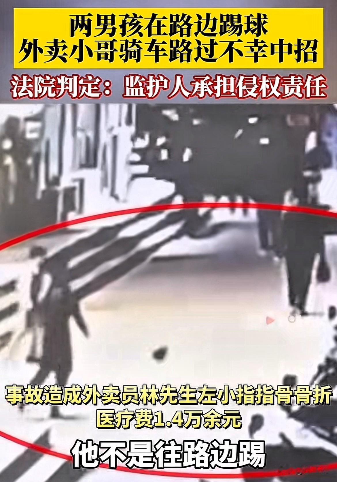 这不是无理取闹吗?江苏江阴,两个小男孩在街边踢球,一不小心球踢到了外卖员车下,造成外卖员摔倒骨折治疗花了14000元,然而孩子家长却认为不能都怪孩子:“外卖员车速过快,没有刹车,至少承担事故50%的责任!” 最后闹到了法院! 也就是碰巧了,足球正好滚到了外卖小哥车下,现在外卖小哥左小指骨折,花了这么多钱,家长却不想承担全部责任,认为他就应该及时刹车,完全能避免这次事故! 然而法院了解事实证据后,最后判定外卖小哥属于正常行驶,没有任何过错,不承担相应责 任! 我觉得,这种情况家长就应该承担全部责任,球是导致事故的直接因素,怎么还能怪人家外卖员?自己没有意识到小孩在街边踢球会带来的危险,不仅仅是对他人,对自己小孩也是有危险的。 出了事永远不会在自己身上找原因,只知道推卸责任,把问题推到别人身上,作为孩子父母这样言行教育孩子,真的合理吗? 关于这个事,大家怎么看呢?欢迎评论区分享讨论! (信息来源:第1眼新闻)