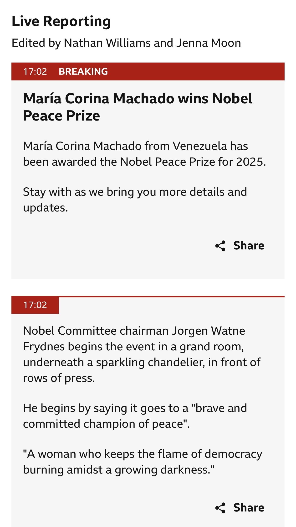 英国广播公司(BBC)官网10月10日报道:今年诺贝尔和平奖得主是 来自委内瑞拉的玛丽亚·科里纳·马查多荣获2025年诺贝尔和平奖。 报道说,每项诺贝尔奖都包括一枚奖章、一份个人证书和一笔现金奖励。今年,每项奖项将获得1100万瑞典克朗(869,484英镑;1,156,395美元)。这意味着如果一个人获得该奖项,他将获得全部奖金,但如果一组科学家获得该奖项,他们将共同分享这笔奖金。 据诺贝尔委员会称,今年有338名候选人被提名。其中,244名是个人,94名是组织,委员会说”比去年有显著增加”。已故俄罗斯反对派领袖阿列克谢·纳瓦尔尼的遗孀尤利娅·纳瓦尔纳娅和乌克兰总统弗拉基米尔·泽连斯基都在候选人名单中。 报道说,去年有286名候选人,而2016年,该奖项的候选人数量达到历史最高,有376名候选人。