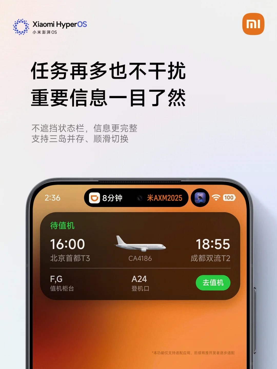 欢迎登陆小米超级岛! 支持三岛并存,任务再多也互不干扰; 信息顺畅切换,为你完整呈现最关注的信息; 无需中止当前应用,下拉小窗即用即走; 行程信息,还能便捷拖拽顺手分享。 小米澎湃OS3