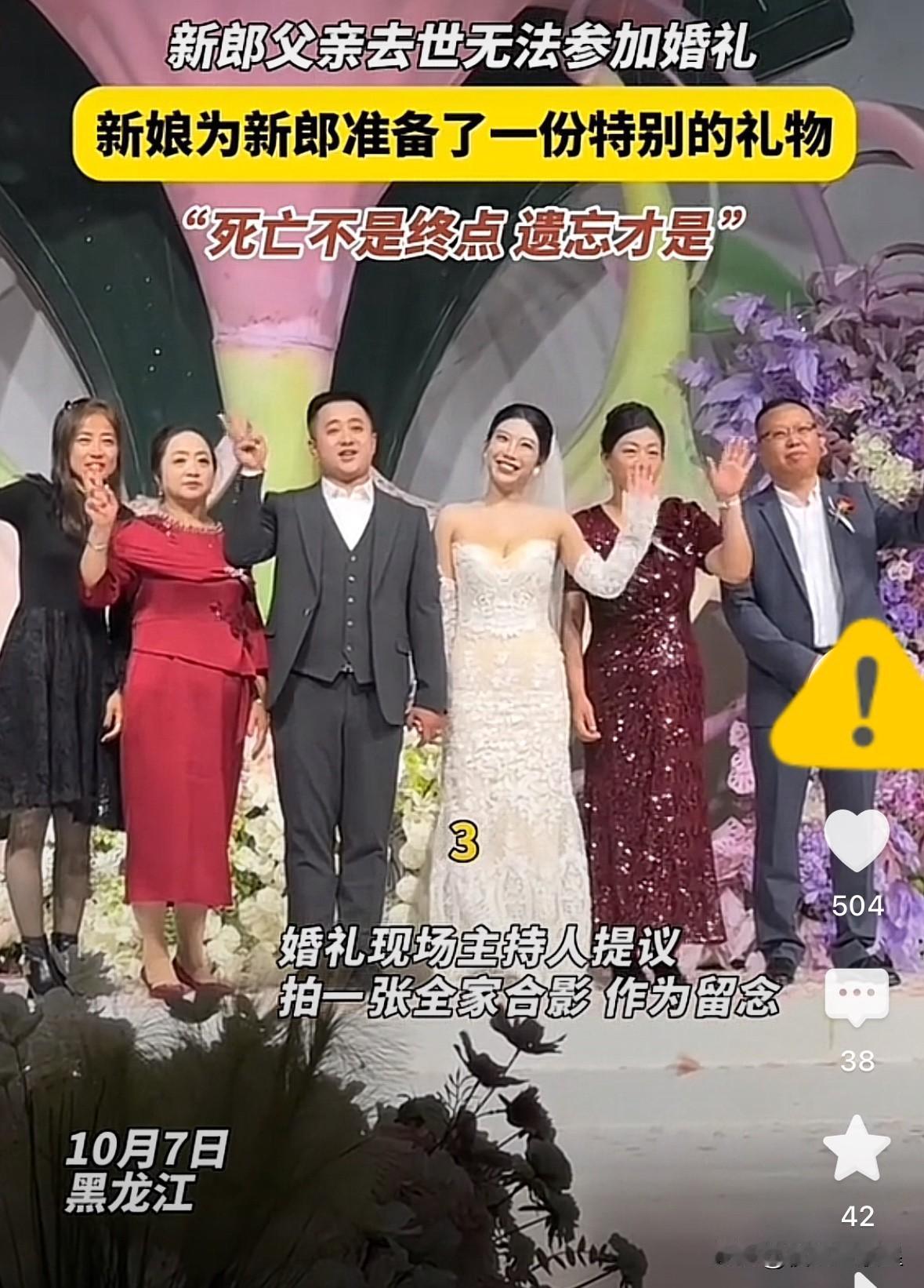 果然,真的没想到, 一张全家福,藏着1个“不可能”的身影 婚礼当天,新娘递来的全家福让在场32人瞬间沉默——照片里,竟站着新郎已故3年的父亲。 所有人都以为是新娘粗心拿错旧照,连新郎自己都红着眼眶想掩饰,新娘却突然按住他的手。 原来,新娘偷偷找画师,根据老人生前照片和视频,把他“画”进了全家福。她翻遍新郎手机里300多张旧照,反复调整老人的笑容弧度,只为让新郎在人生最重要的日子里,能和“完整的家人”合影。 这张特殊的全家福,没有血缘却满是心意,让在场的人明白:真正的爱,从不会被生死隔断,只会用温柔的方式,悄悄补齐所有遗憾。