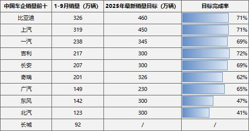 随着“金九银十”销售旺季的到来,各大车企也打响了全年销售目标冲刺战。在今年1-9月销量前十的车企中,比亚迪、一汽、吉利以70%多的目标完成率领跑市场。在新能源渗透率持续上涨的趋势下,各大车企的销量和全年目标完成率也呈现出明显的分化,其中多家车企销量目标达成率亮眼。 处于第一梯队销量300万以上的比亚迪和上汽都是71%的销量目标完成率。比亚迪326万辆持续领跑市场,是国内和全球市场的新能源销量冠军。而上汽在新能源和燃油双线并行下以319万辆保持稳健态势。 第二梯队销量200万以上的一汽、吉利、长安、奇瑞则是69%、72%、69%、62%的年度销量目标完成率。吉利是这里面完成率表现最好的车企,这也得益于新能源车型的贡献。 随着新能源渗透率持续保持高位,新能源车型的贡献也将在很大程度上决定车企后续的走势,1-9月各大车企的销量和目标完成率也是呈现明显分化。不得不说,随着技术创新,产业布局和科技平权,国产新能源正逐渐成为消费者购车的首选,消费者对新能源的认可度也越来越高。 可以说,谁能在新能源上做到技术的快速迭代,产能的合理布局,还有对市场需求的快速反应,谁就更能达成销量目标。年底的销量冲刺战,让我们看看谁能笑到最后。