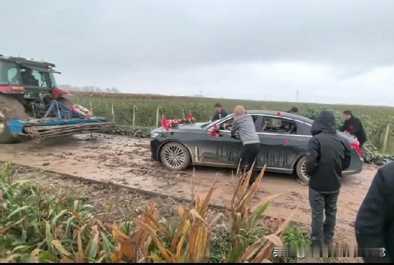 迎亲路上秒变“泥潭特种兵”! 家人们快看这迎亲名场面!婚车陷进泥地动弹不得,直接喊来拖拉机硬核救场,新郎这边的“迎亲特种兵”是真·使命必达啊! 本以为是风风光光娶亲,结果在泥地里上演“乡村越野赛”,婚车满身泥污,拖拉机霸气护航,这画风反差直接笑翻全网!有人调侃“这婚结得接地气,以后日子肯定踏实”,也有人吐槽“太狼狈,婚礼仪式感碎一地”。 咱就问,你能接受自己的迎亲路这么“硬核”不?这种接地气的婚礼是真实在,还是有点掉价?你觉得婚礼该不该讲究排场?