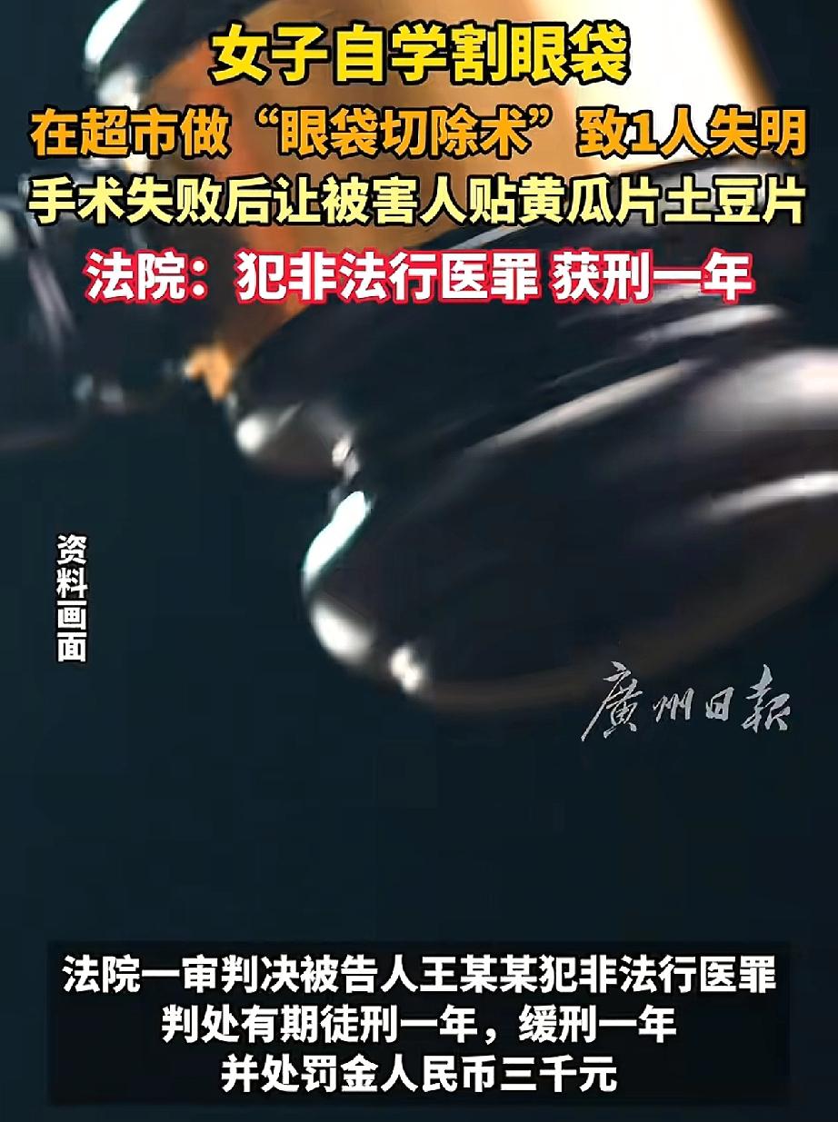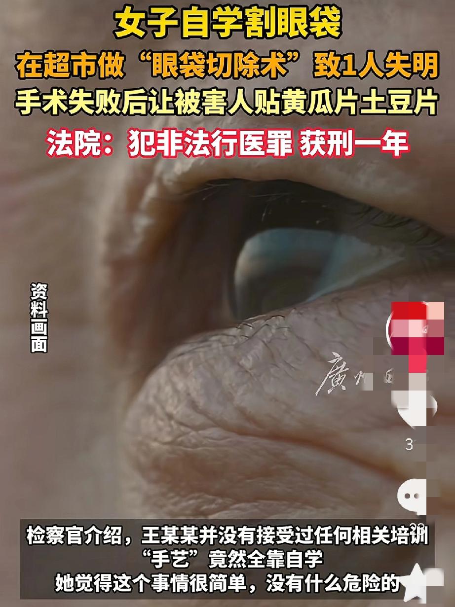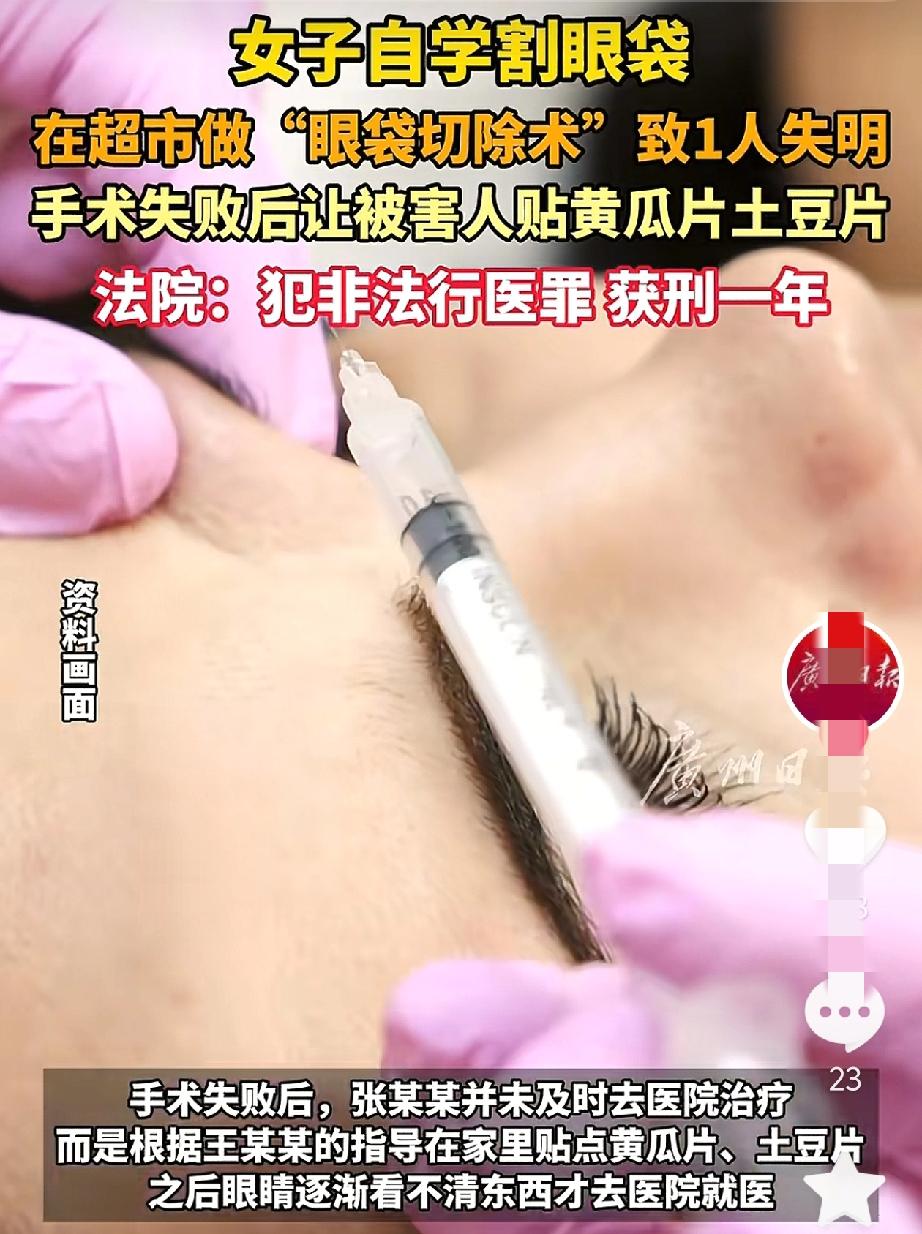 “没想到意外还是发生了!”内蒙古赤峰一女子“自学成才”。在超市里面当起了美容医生,她自认为这很简单。结果意想不到的事情发生了。 王某某没有经过任何培训,只是从网上看到一些操作和资料,便认为这没有什么可难的,她便无证上岗了。她的医疗场所更是让人匪夷所思。 被害人张某某就是王某某带其进入超市场所进行割眼袋手术。术后张某某眼睛肿胀,左眼视力受损。经鉴定,张某某的左眼睛视神经萎缩,左眼盲目5级构成8级伤残。 手术失败后,张某某便根据王某某提供的方法,将其脸部敷上黄瓜片,土豆片。由于时间过长,逐渐看不清东西才去医院就医。此时后果已经很严重了。事后张某某便将王某某告上了法庭。 此事也引起了网友们的热议,有网友说:“超市,割眼袋,手术失败,变瞎子了,然后贴黄瓜片,每一句话都好炸裂。” 还有网友说:“认识一个做美甲的,先是做美甲接睫毛和纹眉,慢慢做美容,然后业务扩大了,发一些去哪里哪里听课的,回来就开始给人打瘦脸针,做双眼皮这些,反正我是不敢做这种人做。” 也有网友说:“超市这个医生胆大,但我更佩服这些去超市割眼袋的人。” 爱美之心,人人有之。随着现在的医疗条件的逐步提升,很多人都开始对自己的长相有所不满。甚至会做一些小型的手术进行调整。学校的手术也一定要去正规的医院。不要听别人胡乱的“忽悠”你。 市面上的医院我们还不清楚它有没有资格,营业执照等资质。去“超市”做整形,一听就是不靠谱的,怎么还能敢去呢? 对此你怎么看?