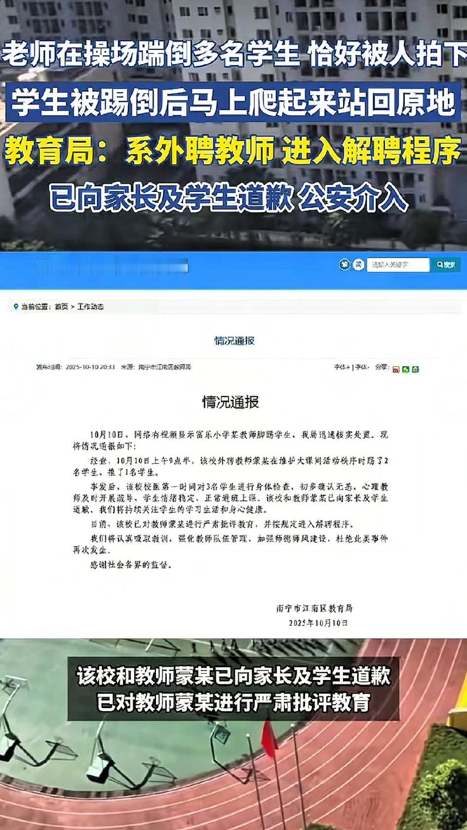 老师在操场踹倒学生,学生被踹倒后马上爬起来站回原位,这一幕恰好被人拍到,引起轩然大波。其一,不管学生对错,老师踹倒学生本就是一种体罚,是被明令禁止的。其二,即使没有人拍到这一幕,只要有学生反馈给家长,家长追究到底,整个操场至少一百个人的学生作为证人,这个老师也必定被曝光。其三,教育局的处理及时到位,即使是正式的有编制的老师,也应该做开除处理。最后,一切对学生缺乏爱心和耐心的人,都应该被清除教师队伍。