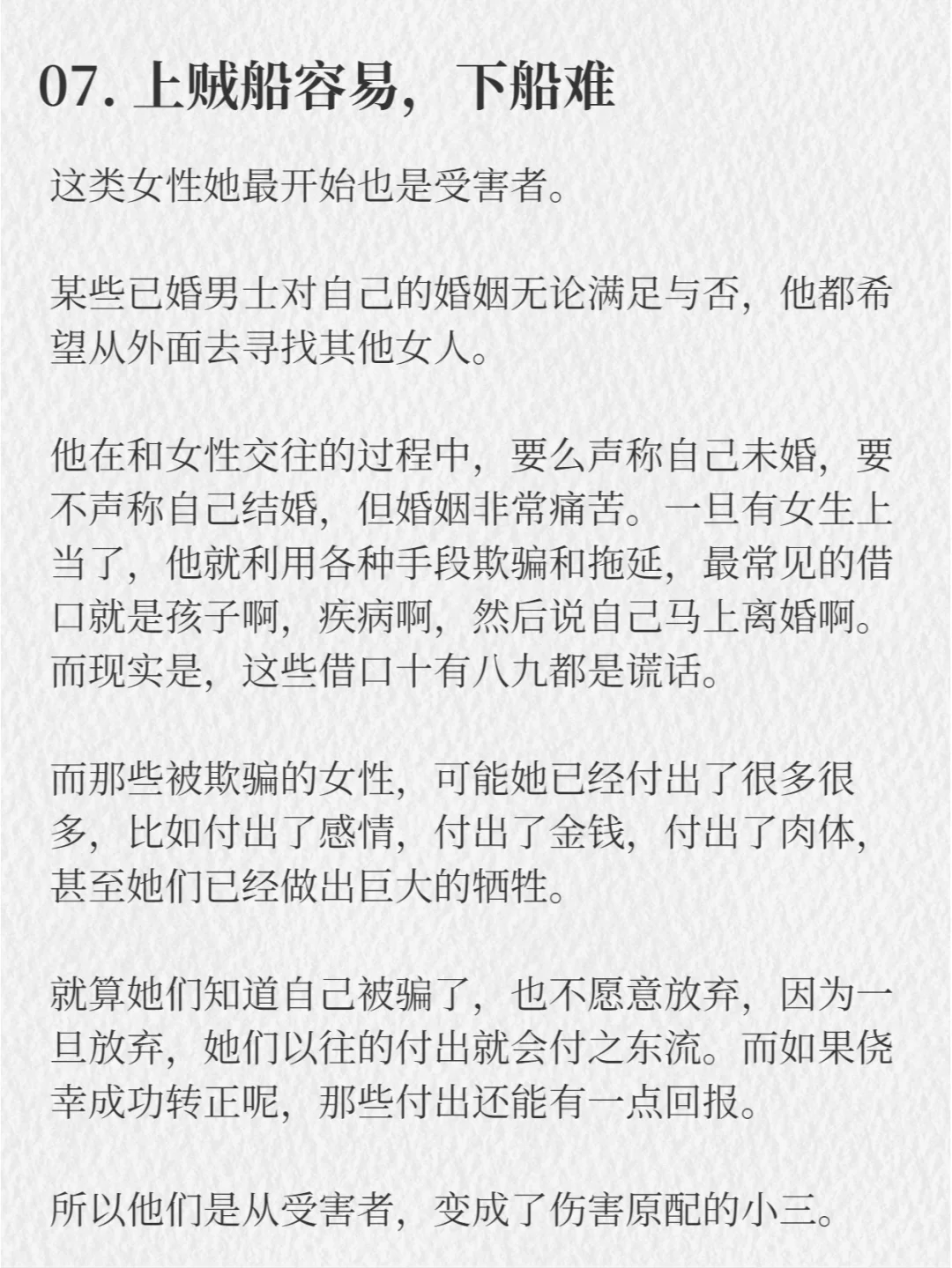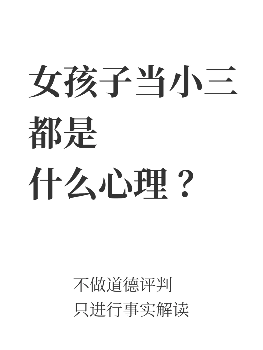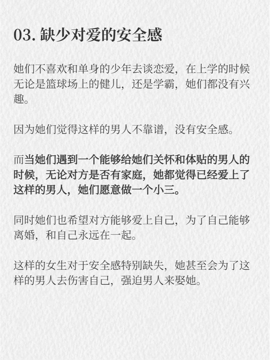 而当他们遇到一个能够给他们关怀和体贴的男人的时候,无论对方是否有家庭,他都觉得已经爱上了这样的男人,她们愿意做一个小三。