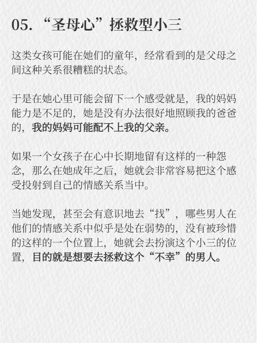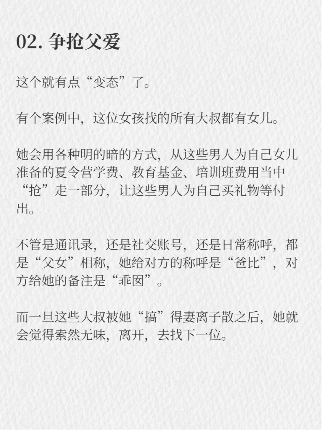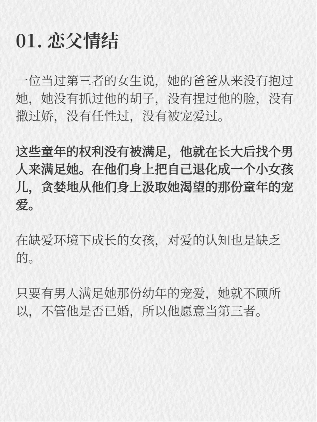 一位当过第三者的女生说,她的爸爸从来没有抱过她,她没有抓过他的胡子,没有捏过他的脸,没有撒过娇,没有任性过,没有被宠爱过。