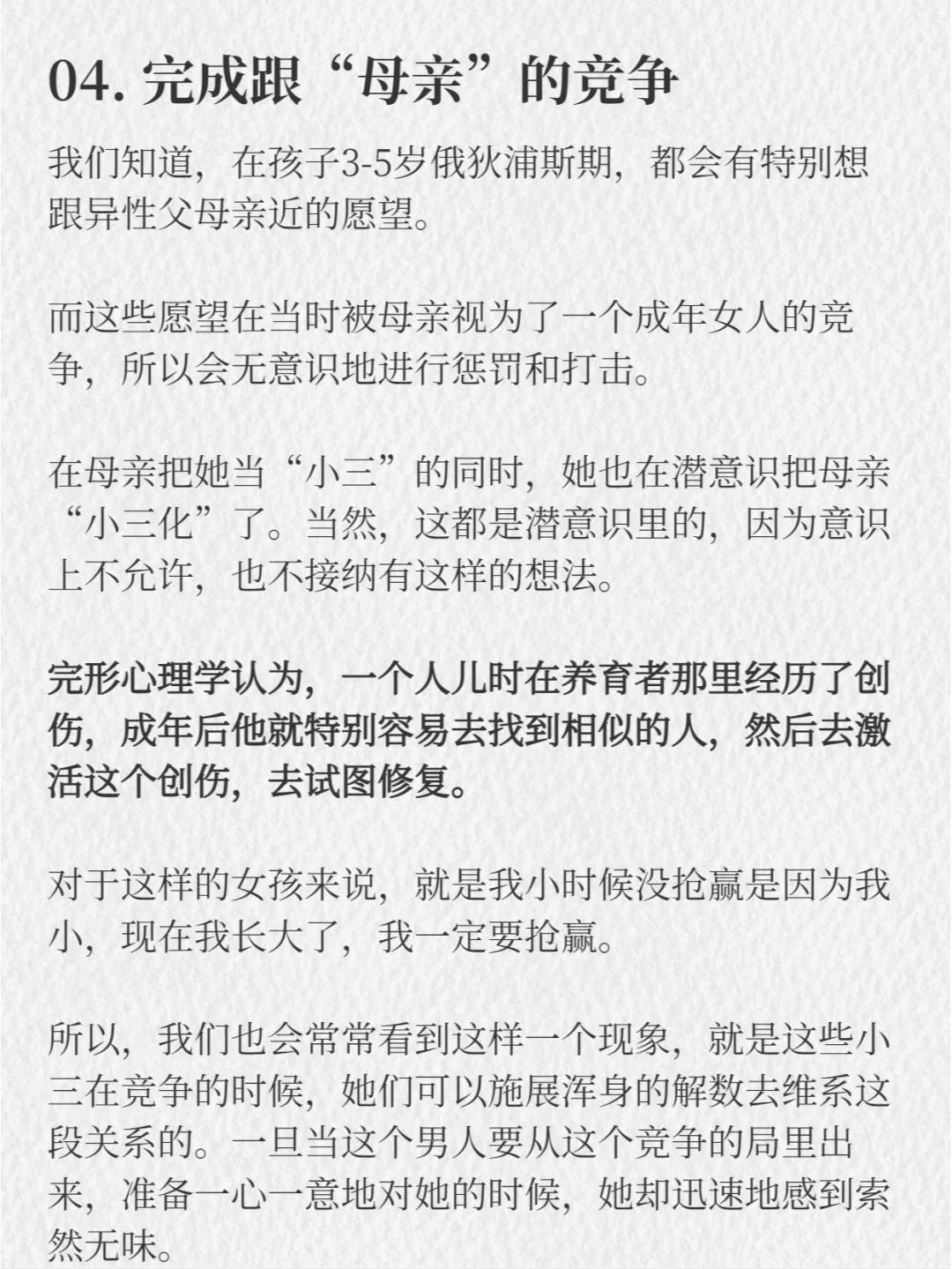 而这些愿望在当时被母亲视为了一个成年女人的竞争,所以会无意识地进行惩罚和打击。