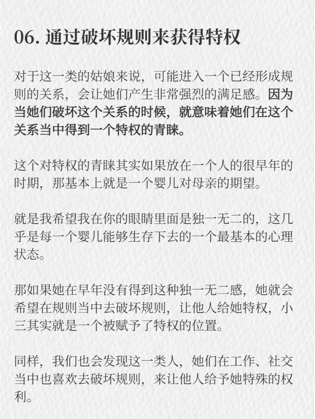 对于这一类的姑娘来说,可能进入一个已经形成规则的关系,会让她们产生非常强烈的满足感。因为当她们破坏这个关系的时候,就意味着她们在这个关系当中得到一个特权的青睐。