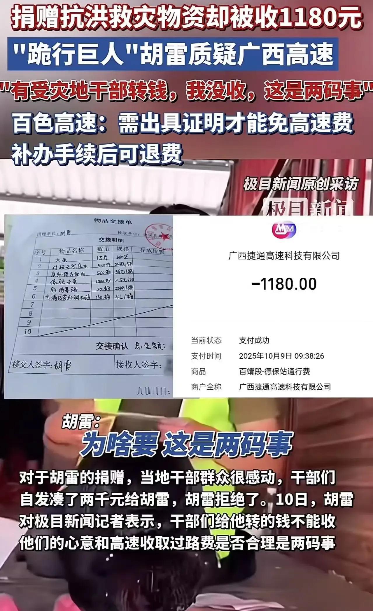 广西高速最近火了,但火的原因却让人气愤!一位爱心人士胡雷icon向广西百色捐赠抗洪救灾物资,走高速报备后竟被收取了1180元高速费,这究竟是怎么回事? 胡雷icon是一位热衷于公益的爱心人士,他此次向广西百色捐赠抗洪救灾物资,本是出于善意和爱心。在走高速前,他也按照规定进行了报备,本以为可以顺利通行,没想到却遭遇了这样的“刁难”。据胡雷介绍,全中国只要报备的物质,都是免高速路费的,这是国家明确规定的事情。然而,在广西某高速路段,他却被告知需要缴纳1180元的高速费。胡雷对此表示极度不满,他质疑为何到了这个地方,国家规定的事情就得不到执行,反而被刁难。此事一经曝光,立即引发了网友们的热议,大家纷纷表示支持胡雷,认为高速收费站的做法有违国家规定,也伤害了爱心人士的善心。 胡雷的遭遇让我们看到了公益路上的不易,也让我们更加珍惜那些默默付出、无私奉献的爱心人士。希望相关部门能够尽快查明真相,给胡雷一个公正的答复。大家对此事有何看法?欢迎在评论区留言讨论!广西水灾救援 榕江洪水捐款
