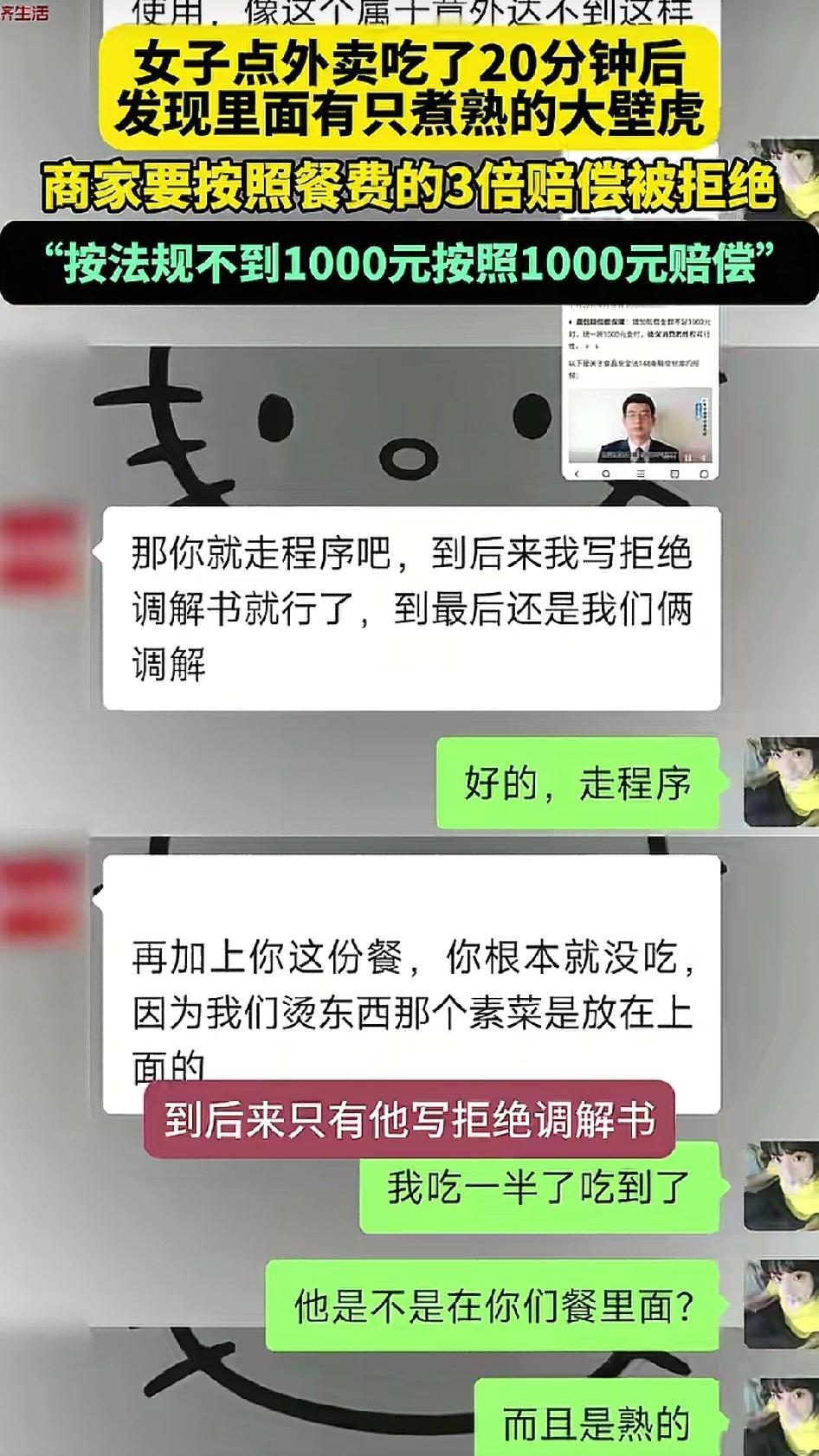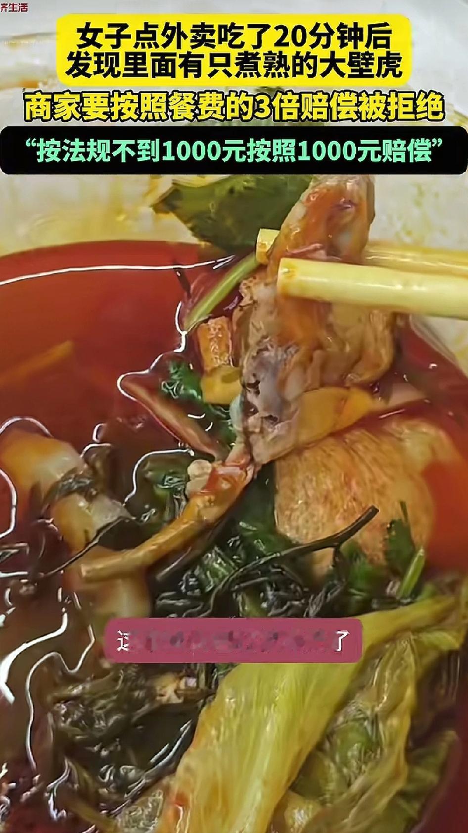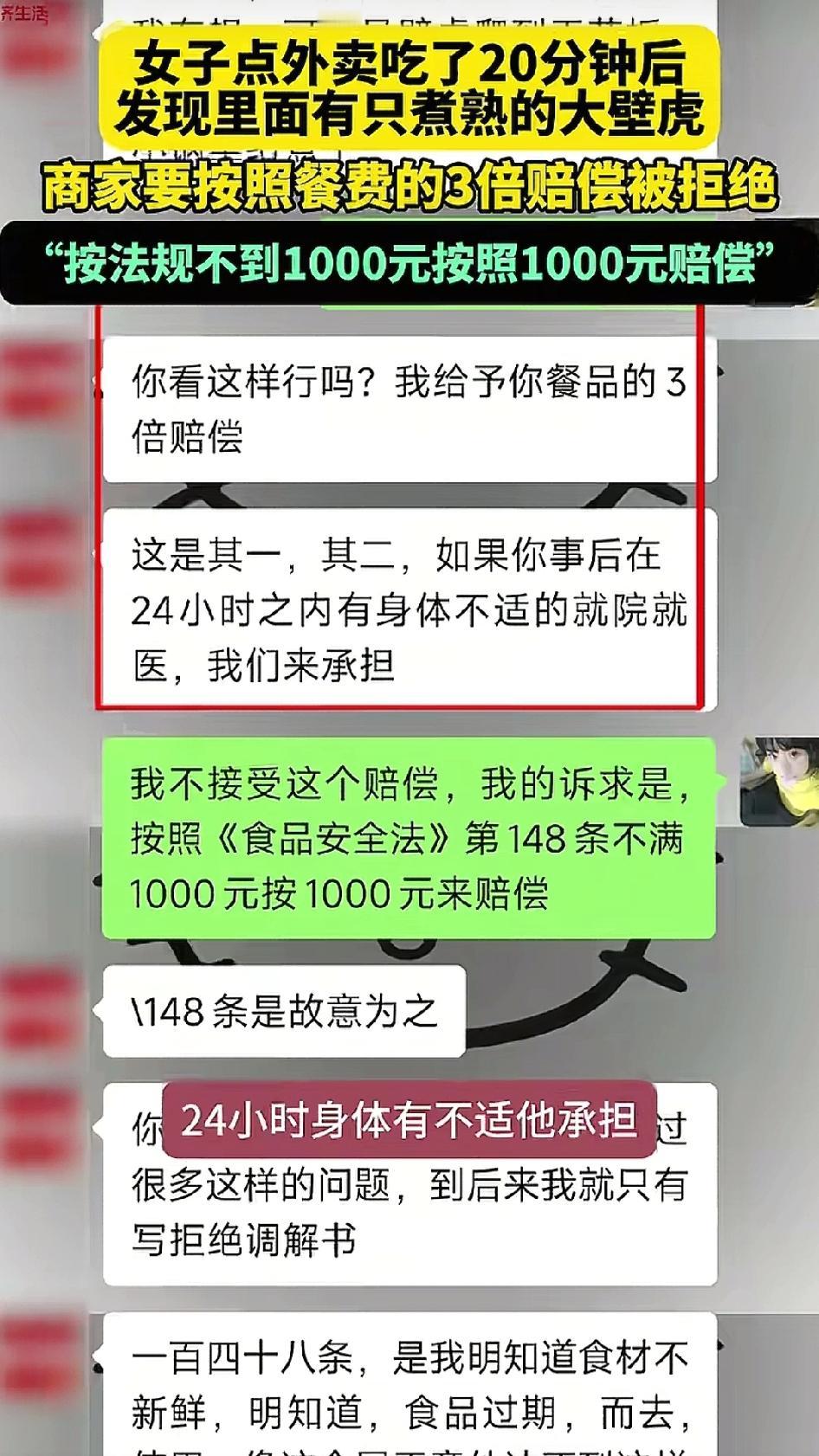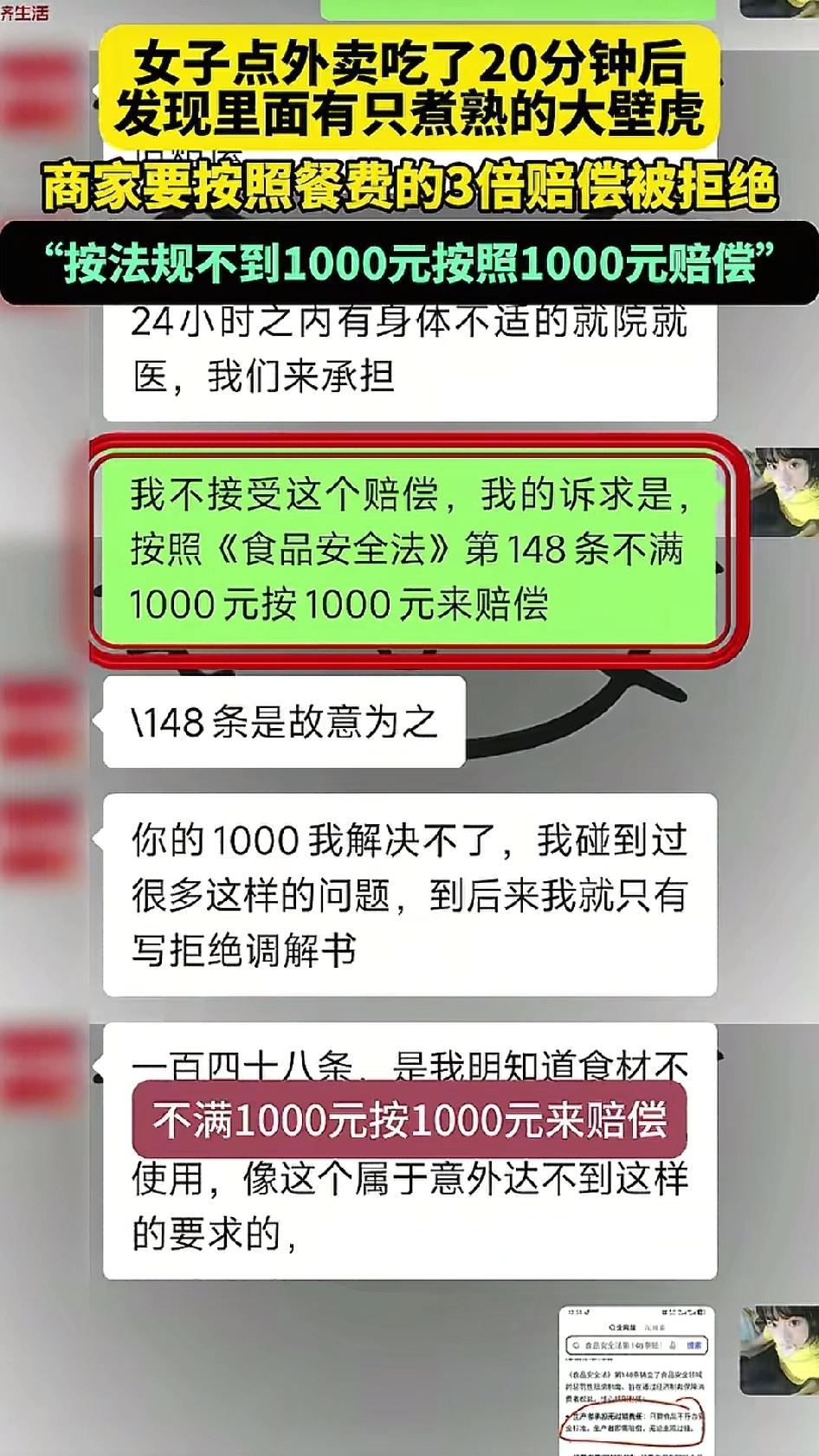 点外卖吃到小壁虎,你会怎么办?? 一女子点外卖,吃了20分钟后,突然发现外卖餐盒里好像有一只小壁虎,女子把壁虎夹起来看,发现壁虎已经被煮熟煮烂了。女子把情况反馈给商家,商家态度还算诚恳,给女子3倍赔偿,并且如果女子在24小时内身体有不适住院,所有费用商家承担。 但是,女子不同意,要求商家赔偿1000元。而该女子的依据是《食品安全法》第148条:生产或经营不符合安全标准的食品,消费者除要求赔偿损失外,还可主张价款十倍或损失三倍的赔偿金;若增加赔偿金额不足1000元,按1000元赔偿。 我认为,女子的诉求完全符合这一规定,并且无需证明自身实际损失。现在商家拒绝这一要求,并且威胁最后无论到哪个部门,都是商家和顾客之间调解,意思是不如趁早接受3倍赔偿,最后可能也是3倍赔偿!