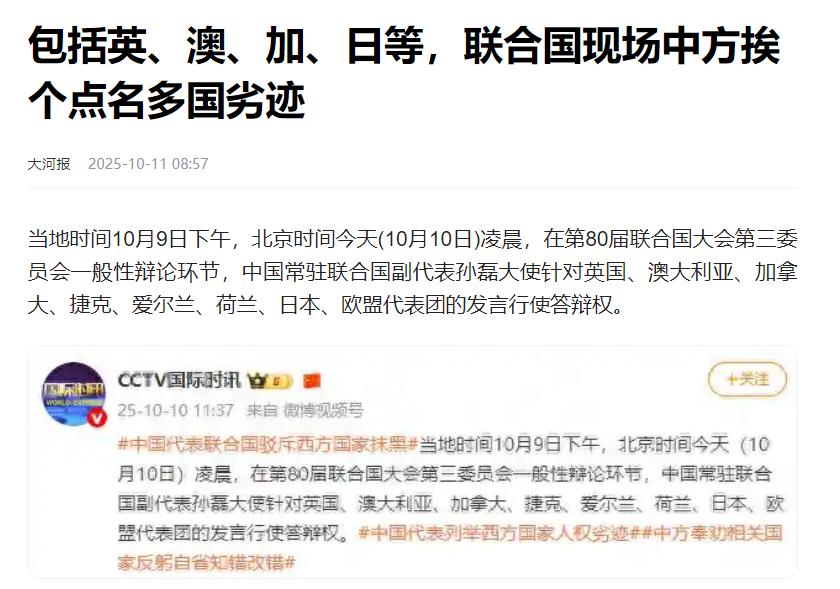 挨个点名,有些国家做的那些事我们可没忘! 当地时间10月9日,第80届联合国大会第三委员会一般性辩论正在进行,中国常驻联合国副代表孙磊大使当场站起身来行使答辩权,把英国、澳大利亚、加拿大、捷克、爱尔兰、荷兰、日本和欧盟这些代表团的真实面目一一揭开。 会上,这些代表团又在老调重弹,拿所谓的涉疆、涉港、涉藏问题说三道四,其实就是想借人权的幌子干扰国际合作,中方早就明确表态:对这种行为强烈不满、坚决反对。 人权从来都不是政治工具,更不能用来干涉别国内政,可这些国家偏偏揣着双重标准装糊涂,批评别人之前连自己的问题都没解决好。 英国国内的种族主义问题现在是越来越严重,少数族裔在找工作、上学时经常受到歧视,街头甚至还出现针对少数族裔的暴力事件。要知道英国当年搞殖民主义留下的烂摊子至今没收拾干净,奴隶制的历史污点也没真正反思,现在倒有脸对别人指手画脚。 澳大利亚原住民的日子也不好过,不仅平均寿命比白人低8岁,连基本的教育和医疗资源都得不到公平分配,难民被非法拘禁的事情更是屡见不鲜,海外驻军还犯下过战争罪行,这些账还没算清楚,哪来的底气谈人权? 加拿大的情况更让人揪心,寄宿学校遗址里挖出了上千具土著儿童的遗骸,这段黑暗历史至今没有给受害者家属一个合理的交代,国内白人至上主义还在挤压少数族裔的生存空间,这样的国家谈人权简直是笑话。 捷克、爱尔兰、荷兰这几个国家也没好到哪去,对罗姆人的歧视和污名化从来没停止过,“伊斯兰恐惧症”在社会上蔓延,极右翼势力越来越嚣张,把社会搞得乌烟瘴气,却还忙着用“言论自由”当挡箭牌。 日本更是揣着明白装糊涂,二战时期强征“慰安妇”、实施殖民统治的反人类罪行,到现在都不肯正视,还在教科书里篡改历史,对冲绳原住民的歧视也一直存在,被人戳穿后就急着辩解,越辩解越显得心虚。 而总爱充当“人权教师爷”的欧盟,地中海里每年都有难民沉船的悲剧发生,边境线成了难民的“死亡陷阱”,欧盟各国还互相推诿,把难民当皮球踢来踢去,自己都这么做,却对他国内政指手画脚,双重标准也太明显了。 孙磊大使说得很清楚,中国反对把人权政治化、武器化,也劝这些国家好好反躬自省。人权不是演讲稿里的漂亮话,而是老百姓实实在在的日子,是出门能安心,生活有保障。自己的问题一堆没解决,反倒忙着给别人“开药方”,这样的行为根本没人会信服。 是非曲直大家都看在眼里,公道自在人心,这些国家想靠抹黑别人转移视线,最终只会搬起石头砸自己的脚。